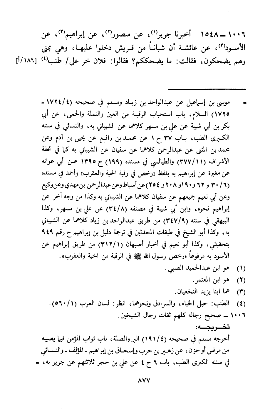 1548 - أَخْبَرَنَا جَرِيرٌ، عَنْ مَنْصُورٍ، عَنْ إِبْرَاهِيمَ، عَنِ الْأَسْوَدِ، عَنْ عَائِشَةَ أَنَّ شُبَّانًا مِنْ قُرَيْشٍ دَخَلُوا عَلَيْهَا وَهِيَ بِمِنًى وَهُمْ يَضْحَكُونَ فَقَالَتْ: مَا يُضْحِكُكُمْ؟ فَقَالُوا: فُلَانٌ خَرَّ عَلَى طُنُبِ فُسَطَاطٍ فَكَادَتْ عَيْنُهُ أَنْ تَذْهَبَ فَقَالَتْ: فَلَا تَضْحَكُوا فَإِنِّي سَمِعْتُ رَسُولَ اللَّهِ صَلَّى اللهُ عَلَيْهِ وَسَلَّمَ يَقُولُ: «§مَا مِنْ مُؤْمِنٍ يُشَاكُ شَوْكَةً فَمَا فَوْقَهَا إِلَّا كُتِبَتْ لَهُ بِهَا دَرَجَةً وَمُحِيَتْ عَنْهُ بِهَا خَطِيئَةً»