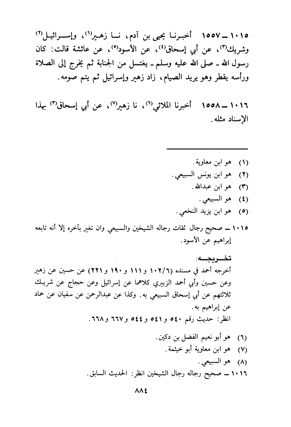 1557 - أَخْبَرَنَا يَحْيَى بْنُ آدَمَ، نا زُهَيْرٌ، وَإِسْرَائِيلُ، وَشَرِيكٌ، عَنْ أَبِي إِسْحَاقَ، عَنِ الْأَسْوَدِ، عَنْ عَائِشَةَ، قَالَتْ: «كَانَ رَسُولُ اللَّهِ صَلَّى اللهُ عَلَيْهِ وَسَلَّمَ §يَغْتَسِلُ مِنَ الْجَنَابَةِ ثُمَّ يَخْرُجُ إِلَى الصَّلَاةِ وَرَأْسُهُ يَقْطُرُ وَهُوَ يُرِيدُ الصِّيَامَ» زَادَ زُهَيْرٌ وَإِسْرَائِيلُ ثُمَّ يُتِمُّ صَوْمَهُ،