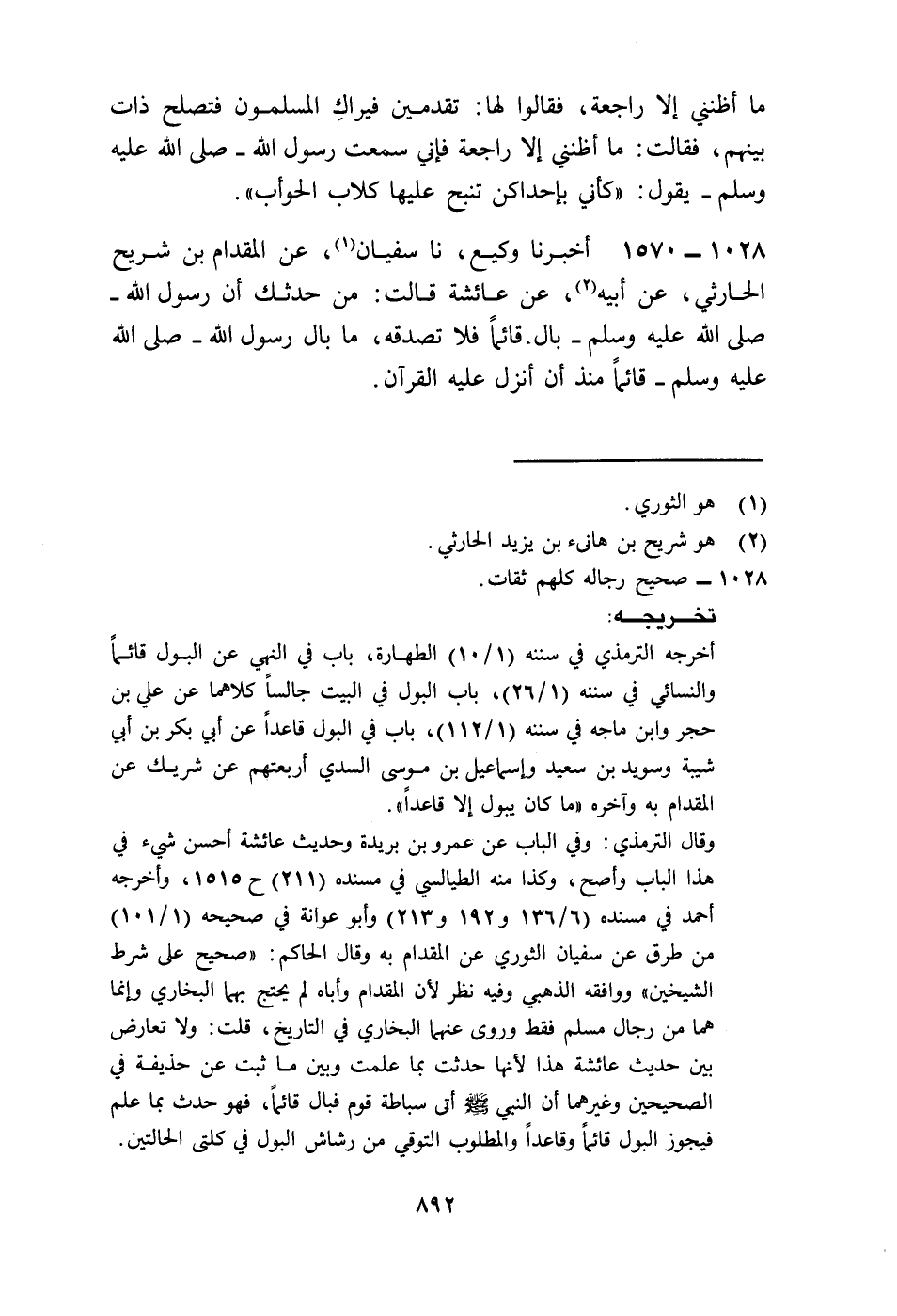 1570 - أَخْبَرَنَا وَكِيعٌ، نا سُفْيَانُ، عَنِ الْمِقْدَامِ بْنِ شُرَيْحٍ الْحَارِثِيِّ، عَنْ أَبِيهِ، عَنْ عَائِشَةَ، قَالَتْ: مَنْ حَدَّثَكَ أَنَّ رَسُولَ اللَّهِ صَلَّى اللهُ عَلَيْهِ وَسَلَّمَ بَالَ قَائِمًا فَلَا تُصَدِّقْهُ «§مَا بَالَ رَسُولُ اللَّهِ صَلَّى اللهُ عَلَيْهِ وَسَلَّمَ قَائِمًا مُنْذُ أَنْ أُنْزِلَ عَلَيْهِ الْقُرْآنُ»