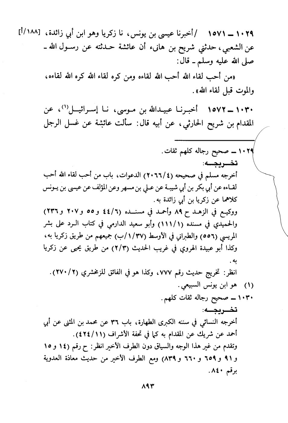 1571 - أَخْبَرَنَا عِيسَى بْنُ يُونُسَ، نا زَكَرِيَّا وَهُوَ ابْنُ أَبِي زَائِدَةَ، عَنِ الشَّعْبِيِّ، حَدَّثَنِي شُرَيْحُ بْنُ هَانِئٍ أَنَّ عَائِشَةَ، حَدَّثَتْهُ عَنْ رَسُولِ اللَّهِ صَلَّى اللهُ عَلَيْهِ وَسَلَّمَ قَالَ: «§مَنْ أَحَبَّ لِقَاءَ اللَّهِ أَحَبَّ اللَّهُ لِقَاءَهُ، وَمَنْ كَرِهَ لِقَاءَ اللَّهِ كَرِهَ اللَّهُ لِقَاءَهُ، وَالْمَوْتُ قَبْلَ لِقَاءِ اللَّهِ»
