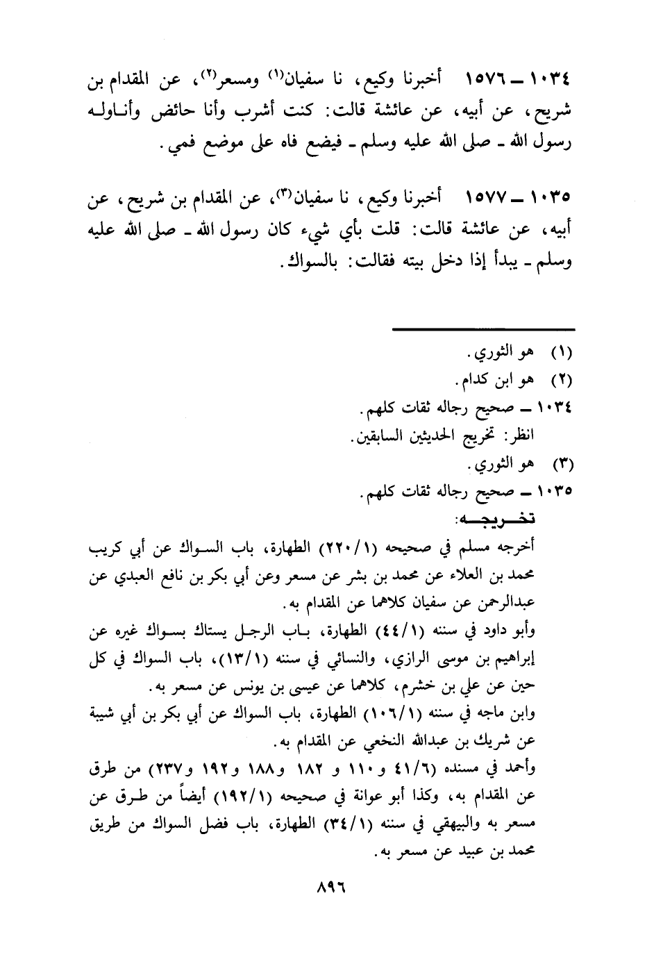 1577 - أَخْبَرَنَا وَكِيعٌ، نا سُفْيَانُ، عَنِ الْمِقْدَامِ بْنِ شُرَيْحٍ، عَنْ أَبِيهِ، عَنْ عَائِشَةَ، قَالَتْ: قُلْتُ: §بِأَيِّ شَيْءٍ كَانَ رَسُولُ اللَّهِ صَلَّى اللهُ عَلَيْهِ وَسَلَّمَ يَبْدَأُ إِذَا دَخَلَ بَيتَهُ؟ فَقَالَتْ: بِالسِّوَاكِ