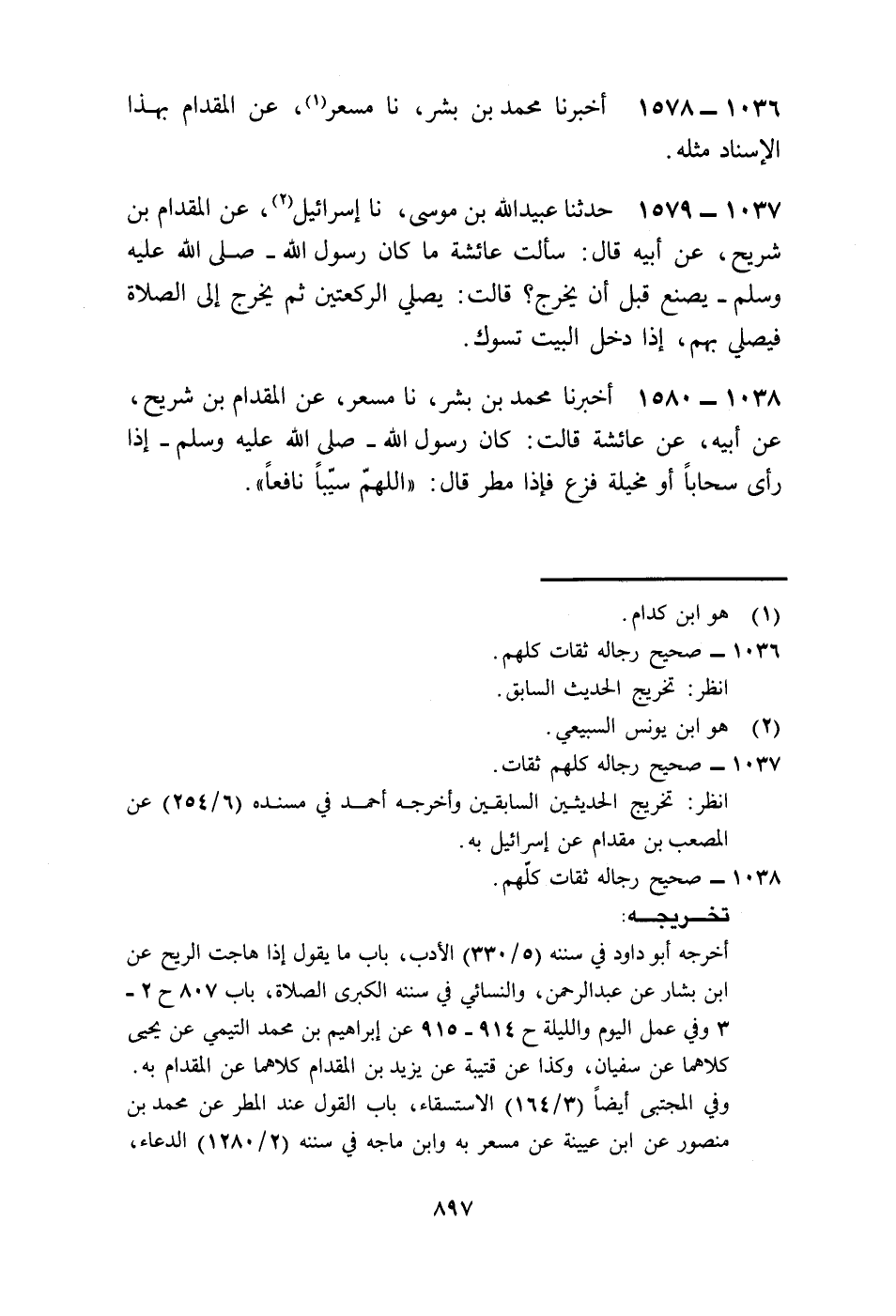1580 - أَخْبَرَنَا مُحَمَّدُ بْنُ بِشْرٍ، نا مِسْعَرٌ، عَنِ الْمِقْدَامِ بْنِ شُرَيْحٍ، عَنْ أَبِيهِ، عَنْ عَائِشَةَ، قَالَتْ: كَانَ رَسُولُ اللَّهِ صَلَّى اللهُ عَلَيْهِ وَسَلَّمَ إِذَا رَأَى سَحَابًا أَوْ مَخِيلَةً فَزِعَ فَإِذَا مُطِرَ قَالَ: «§اللَّهُمَّ سَيْبًا نَافِعًا»