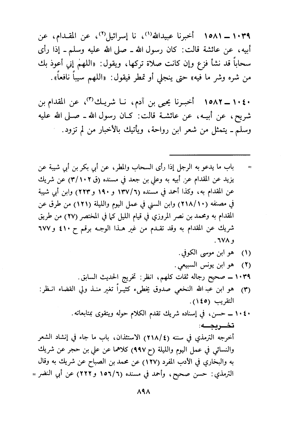 1581 - أَخْبَرَنَا عُبَيْدُ اللَّهِ، نا إِسْرَائِيلُ، عَنِ الْمِقْدَامِ، عَنْ أَبِيهِ، عَنْ عَائِشَةَ، قَالَتْ: كَانَ رَسُولُ اللَّهِ صَلَّى اللهُ عَلَيْهِ وَسَلَّمَ إِذَا رَأَى سَحَابًا قَدْ نَشَأَ فَزِعَ، وَإِنْ كَانَتْ صَلَاةً تَرَكَهَا وَيَقُولُ: " §اللَّهُمَّ إِنِّي أَعُوذُ بِكَ مِنْ شَرِّهِ وَشَرِّ مَا فِيهِ حَتَّى يَنْجَلِيَ أَوْ تُمْطِرَ فَيَقُولُ: اللَّهُمَّ سَيْبًا نَافِعًا "