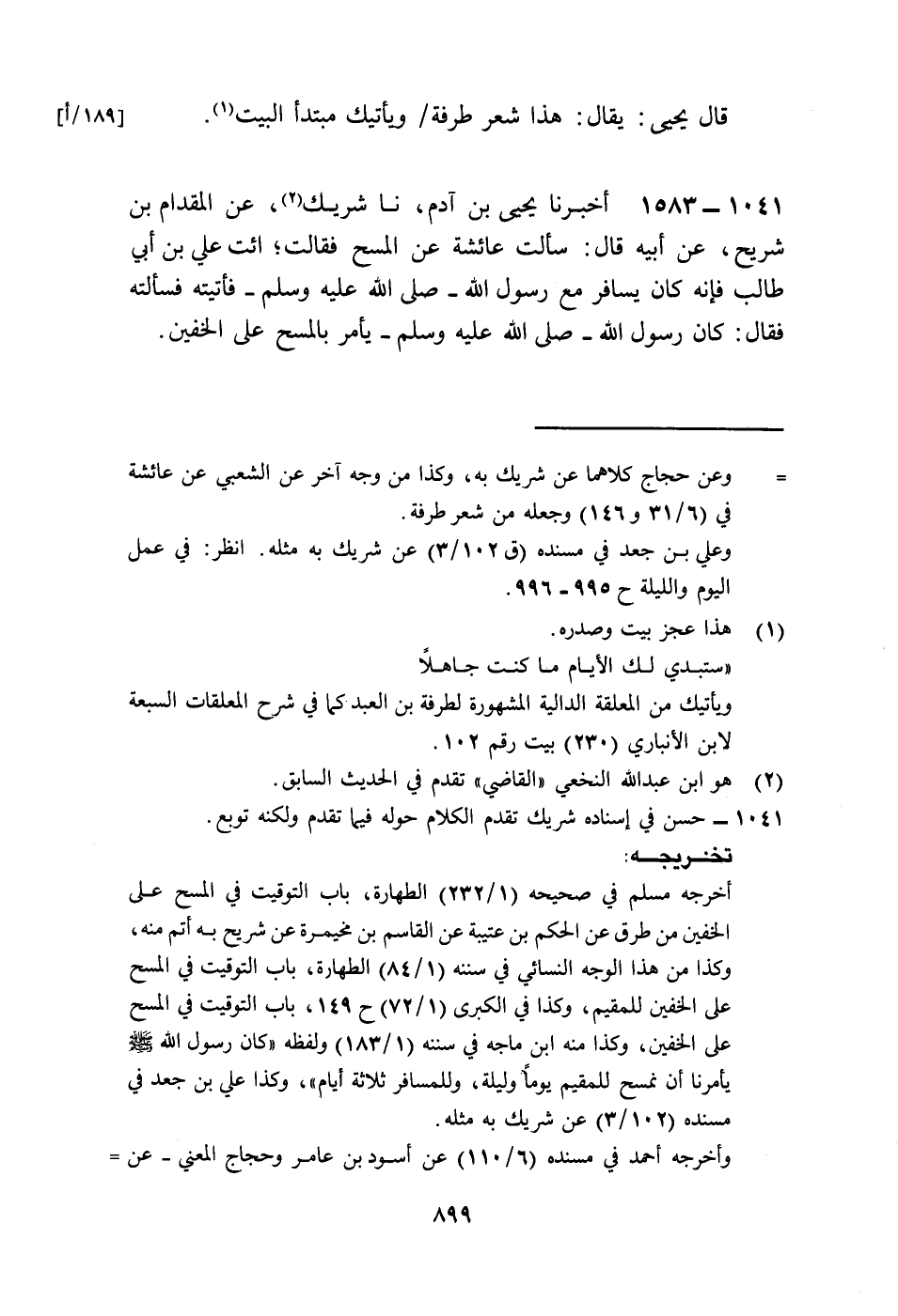 1583 - أَخْبَرَنَا يَحْيَى بْنُ آدَمَ، نا شَرِيكٌ، عَنِ الْمِقْدَامِ بْنِ شُرَيْحٍ، عَنْ أَبِيهِ، قَالَ: سَأَلْتُ عَائِشَةَ عَنِ الْمَسْحِ، فَقَالَتْ: ائْتِ عَلِيَّ بْنَ أَبِي طَالِبٍ فَإِنَّهُ كَانَ يُسَافِرُ مَعَ رَسُولِ اللَّهِ صَلَّى اللهُ عَلَيْهِ وَسَلَّمَ فَأَتَيْتُهُ فَسَأَلْتُهُ، فَقَالَ: «كَانَ رَسُولُ اللَّهِ صَلَّى اللهُ عَلَيْهِ وَسَلَّمَ §يَأْمُرُ بِالْمَسْحِ عَلَى الْخُفَّيْنِ»