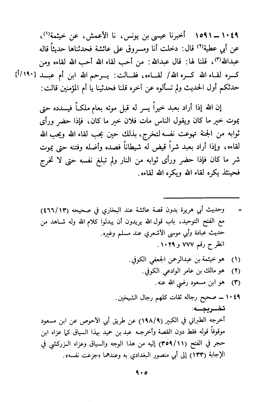 1591 - أَخْبَرَنَا عِيسَى بْنُ يُونُسَ، نا الْأَعْمَشُ، عَنْ خَيْثَمَةَ، عَنْ أَبِي عَطِيَّةَ، قَالَ: دَخَلْتُ أَنَا وَمَسْرُوقٌ عَلَى عَائِشَةَ فَحَدَّثْنَاهَا حَدِيثًا، قَالَهُ عَبْدُ اللَّهِ، قُلْنَا لَهَا: قَالَ عَبْدُ اللَّهِ: " §مَنْ أَحَبَّ لِقَاءَ اللَّهِ أَحَبَّ اللَّهُ لِقَاءَهُ، وَمَنْ كَرِهَ لِقَاءَ اللَّهِ كَرِهَ اللَّهُ لِقَاءَهُ؟ فَقَالَتْ: يَرْحَمُ اللَّهُ ابْنَ أُمِّ عَبْدٍ، حَدَّثَكُمْ أَوَّلَ الْحَدِيثِ وَلَمْ تَسْأَلُوهُ، عَنْ آخِرِهِ. قُلْنَا: فَحَدِّثِينَا يَا أُمَّ الْمُؤْمِنِينَ، قَالَتْ: إِنَّ اللَّهَ إِذَا أَرَادَ بِعَبْدٍ خَيْرًا يَسَّرَ لَهُ قَبْلَ مَوْتِهِ بِعَامٍ مَلَكًا فَيُسَدِّدُهُ حَتَّى يَمُوتَ خَيْرَ مَا كَانَ، وَيَقُولُ النَّاسُ: مَاتَ فُلَانٌ خَيْرَ مَا كَانَ، فَإِذَا حَضَرَ وَرَأَى ثَوَابَهُ مِنَ الْجَنَّةِ تَهَوَّعَتْ نَفْسُهُ لِتَخْرُجَ بِذَلِكَ حِينَ يُحِبُّ لِقَاءَ اللَّهِ وَيُحِبُّ اللَّهُ لِقَاءَهُ، وَإِذَا أَرَادَ بِعَبْدٍ شَرًّا قَيَّضَ لَهُ شَيْطَانًا فَصَدَّهُ وَأَضَلَّهُ وَفَتَنَهُ حَتَّى يَمُوتَ شَرَّ مَا كَانَ، فَإِذَا حَضَرَ وَرَأَى ثَوَابَهُ مِنَ النَّارِ وَلَمْ تَبْلُغْ نَفْسُهُ حَتَّى لَا تَخْرُجَ فَحِينَئِذٍ يَكْرَهُ لِقَاءَ اللَّهِ وَيَكْرَهُ اللَّهُ لِقَاءَهُ