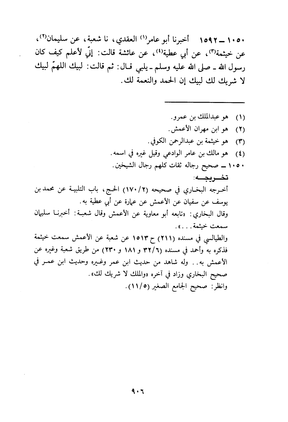 1592 - أَخْبَرَنَا أَبُو عَامِرٍ الْعَقَدِيُّ، نا شُعْبَةُ، عَنْ سُلَيْمَانَ، عَنْ خَيْثَمَةَ، عَنْ أَبِي عَطِيَّةَ، عَنْ عَائِشَةَ، قَالَتْ: " إِنِّي لَأَعْلَمُ كَيْفَ كَانَ رَسُولُ اللَّهِ صَلَّى اللهُ عَلَيْهِ وَسَلَّمَ يُلَبِّي؟ قَالَ: ثُمَّ قَالَتْ: §لَبَّيْكَ اللَّهُمَّ لَبَّيْكَ لَا شَرِيكَ لَكَ، لَبَّيْكَ إِنَّ الْحَمْدَ وَالنِّعْمَةَ لَكَ "