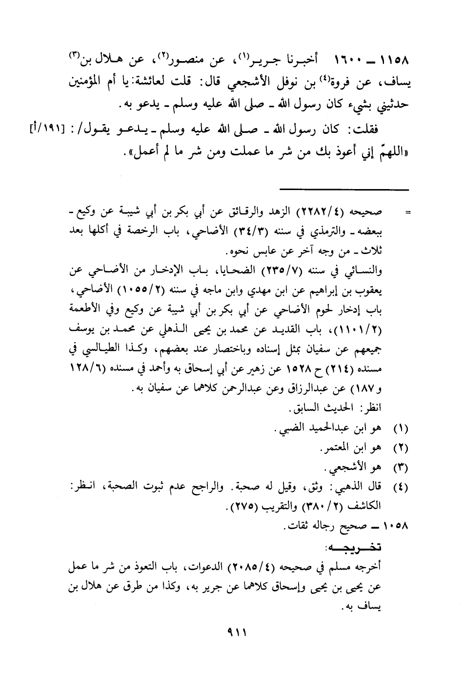 1600 - أَخْبَرَنَا جَرِيرٌ، عَنْ مَنْصُورٍ، عَنْ هِلَالِ بْنِ يَسَافٍ، عَنْ فَرْوَةَ بْنِ نَوْفَلٍ الْأَشْجَعِيِّ، قَالَ: قُلْتُ: لِعَائِشَةَ: يَا أُمَّ الْمُؤْمِنِينَ، حَدِّثِينِي بِشَيْءٍ كَانَ رَسُولُ اللَّهِ صَلَّى اللهُ عَلَيْهِ وَسَلَّمَ يَدْعُو بِهِ، فَقُلْتُ: كَانَ رَسُولُ اللَّهِ صَلَّى اللهُ عَلَيْهِ وَسَلَّمَ يَدْعُو يَقُولُ: «§اللَّهُمَّ إِنِّي أَعُوذُ بِكَ مِنْ شَرِّ مَا عَمِلْتُ وَمِنْ شَرِّ مَا لَمْ أَعْمَلْ»