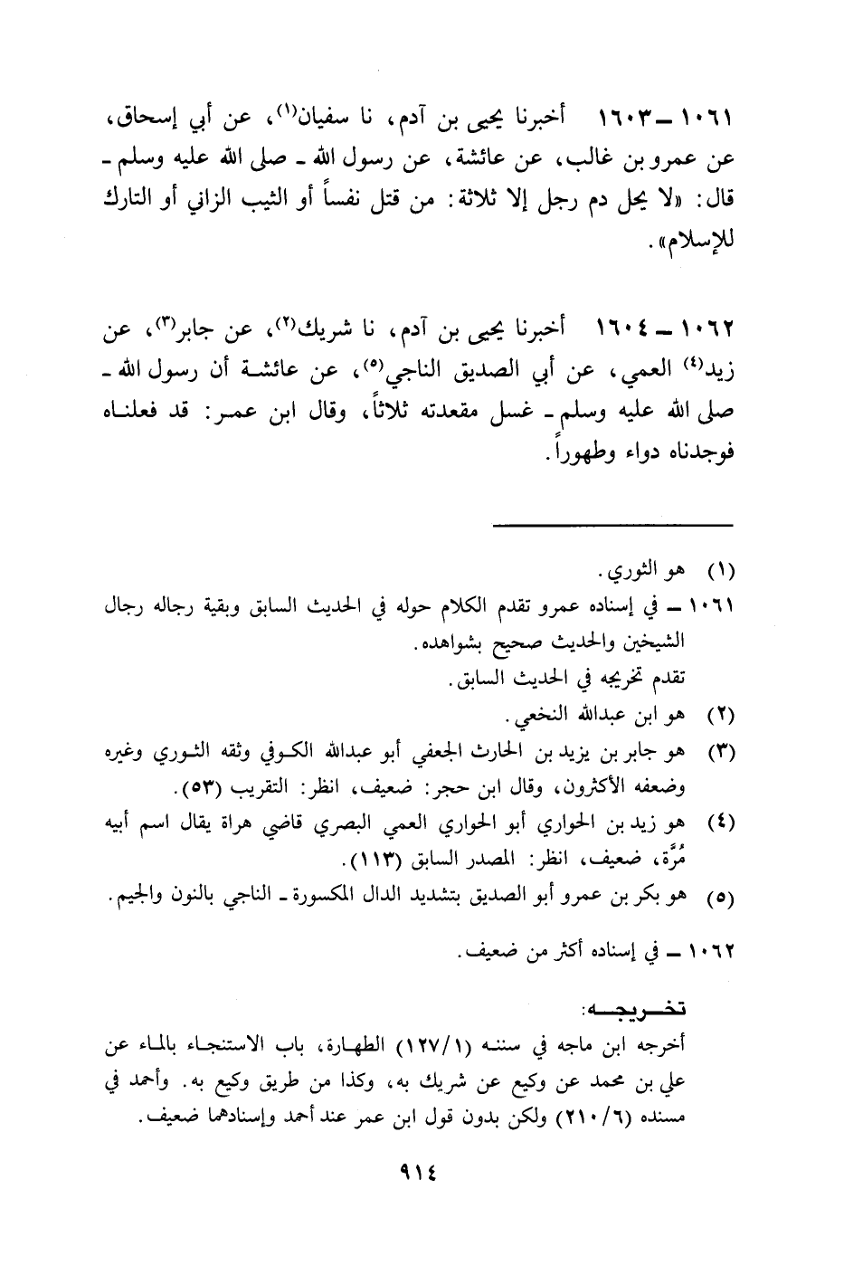 1603 - أَخْبَرَنَا يَحْيَى بْنُ آدَمَ، نا سُفْيَانُ، عَنْ أَبِي إِسْحَاقَ، عَنْ عَمْرِو بْنِ غَالِبٍ، عَنْ عَائِشَةَ، عَنْ رَسُولِ اللَّهِ صَلَّى اللهُ عَلَيْهِ وَسَلَّمَ قَالَ: «§لَا يَحِلُّ دَمُ رَجُلٍ إِلَّا ثَلَاثَةً، مَنْ قَتَلَ نَفْسًا، أَوِ الثَّيِّبُ الزَّانِي، أَوِ التَّارِكُ لِلْإِسلَامِ»