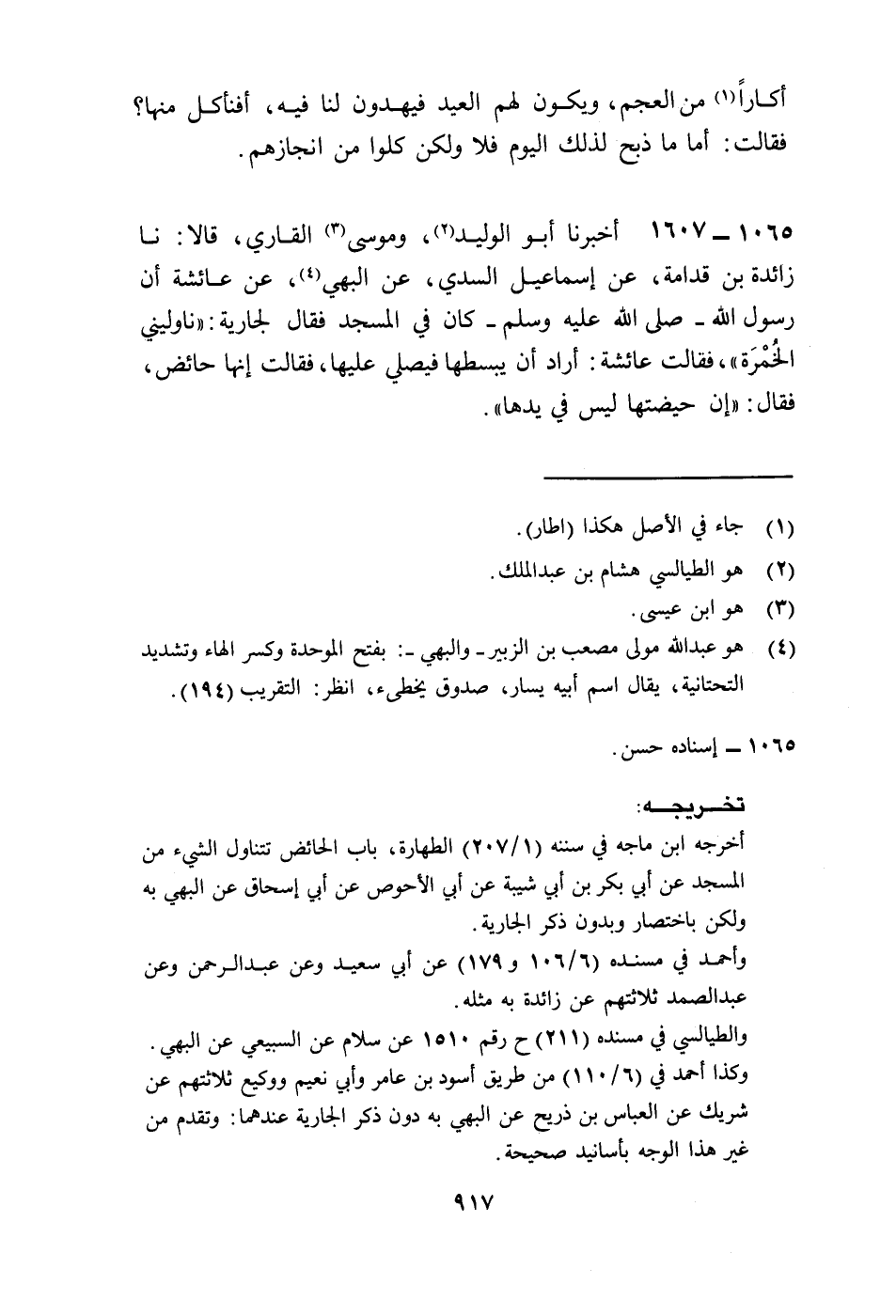 1607 - أَخْبَرَنَا أَبُو الْوَلِيدِ، وَمُوسَى الْقَارِئُ، قَالَا: نا زَائِدَةُ بْنُ قُدَامَةَ، عَنْ إِسْمَاعِيلَ السُّدُّيِّ، عَنِ الْبَهِيِّ، عَنْ عَائِشَةَ، أَنَّ رَسُولَ اللَّهِ صَلَّى اللهُ عَلَيْهِ وَسَلَّمَ كَانَ فِي الْمَسْجِدِ فَقَالَ لِجَارِيَةٍ: " نَاوِلِينِي الْخُمْرَةَ، فَقَالَتْ عَائِشَةُ أَرَادَ أَنْ يَبْسُطَهَا فَيُصَلِّي عَلَيْهَا، فَقَالَتْ: إِنَّهَا حَائِضٌ فَقَالَ: §إِنَّ حَيْضَتَهَا لَيْسَ فِي يَدِهَا "