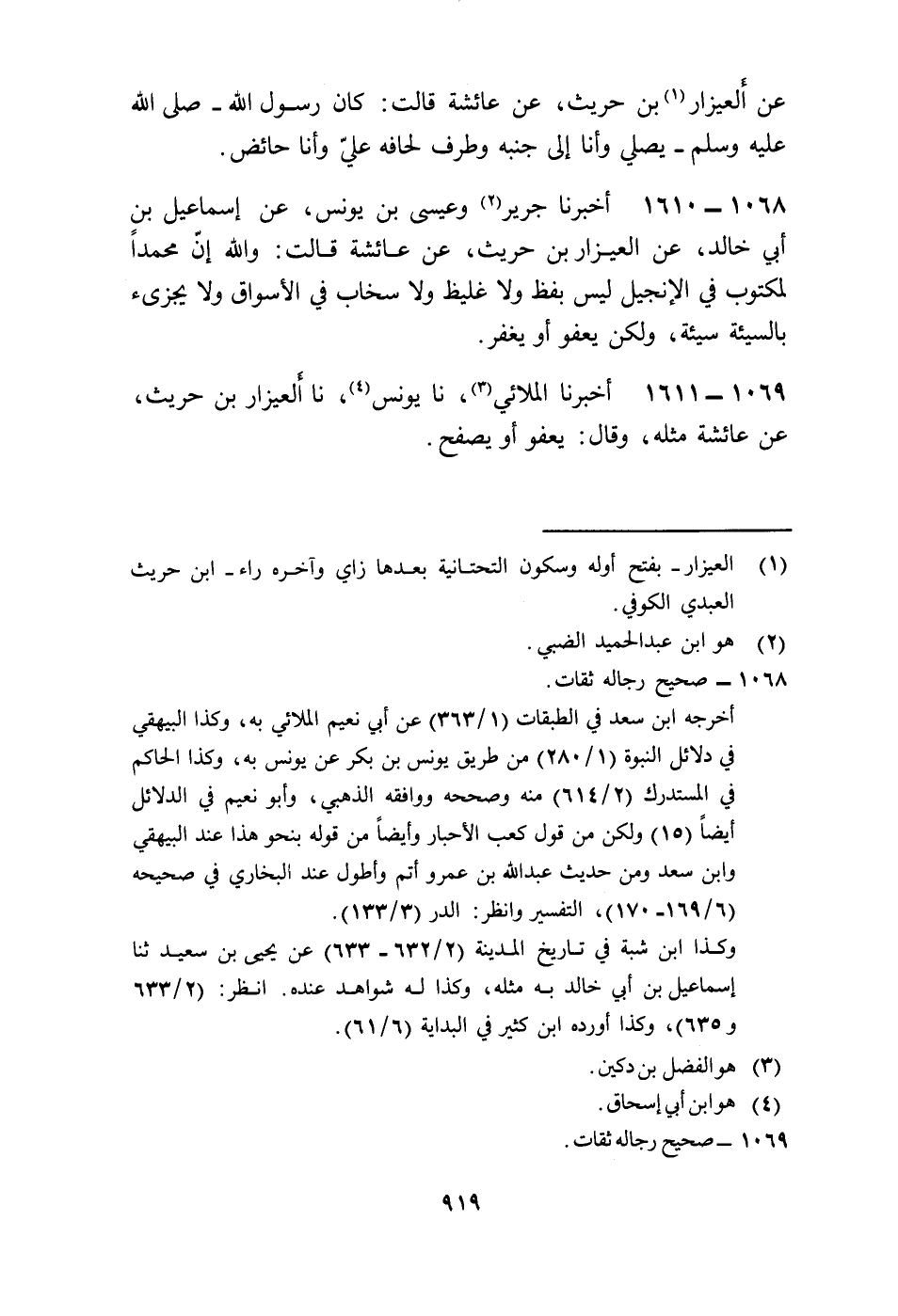1611 - أَخْبَرَنَا الْمُلَائِيُّ، نا يُونُسُ، نا الْعَيْزَارُ بْنُ حُرَيْثٍ، عَنْ عَائِشَةَ، مِثْلَهُ وَقَالَ: يَعْفُو أَوْ يَصْفَحُ