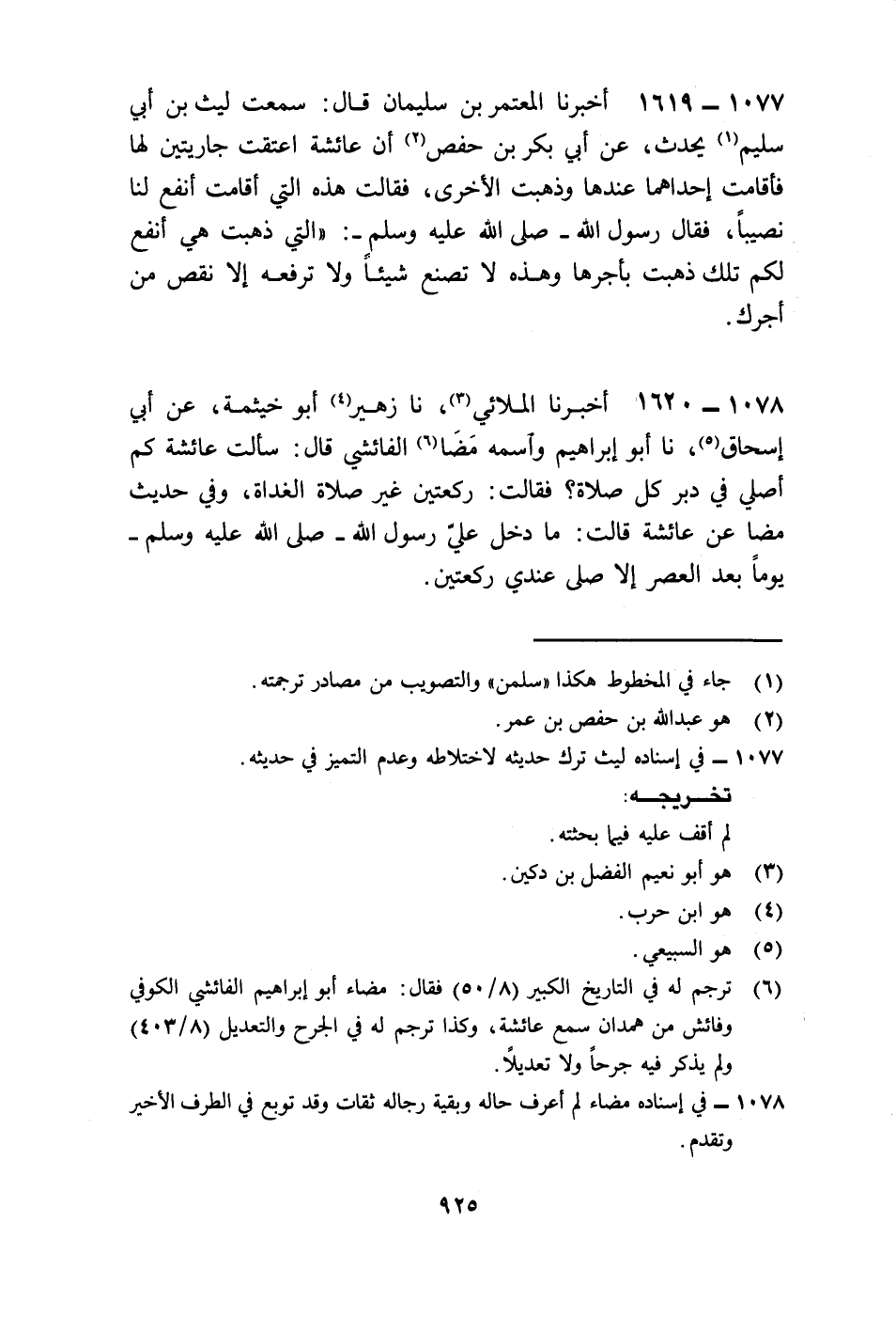 1619 - أَخْبَرَنَا الْمُعْتَمِرُ بْنُ سُلَيْمَانَ، قَالَ: سَمِعْتُ لَيثَ بْنَ أَبِي سُلَيْمٍ، يُحَدِّثُ، عَنْ أَبِي بَكْرِ بْنِ حَفْصٍ، أَنَّ عَائِشَةَ، أَعْتَقَتْ جَارِيَتَيْنِ لَهَا فَأَقَامَتْ إِحْدَاهُمَا عِنْدَهَا وَذَهَبْتِ الْأُخْرَى فَقَالَتْ هَذِهِ الَّتِي أَقَامَتْ أَنْفَعُ لَنَا نَصِيبًا فَقَالَ رَسُولُ اللَّهِ صَلَّى اللهُ عَلَيْهِ وَسَلَّمَ: «§الَّتِي ذَهَبَتْ هِيَ أَنْفَعُ لَكُمْ، تِلْكَ ذَهَبَتْ بِأَجْرِهَا وَهَذِهِ لَا تَصْنَعُ شَيْئًا وَلَا تَرْفَعُهُ إِلَّا نَقَصَ مِنْ أَجْرِكِ»