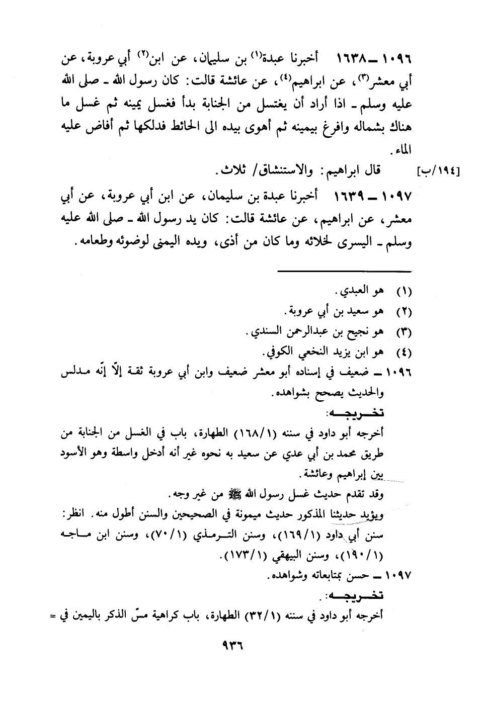 1639 - أَخْبَرَنَا عَبْدَةُ بْنُ سُلَيْمَانَ، عَنِ ابْنِ أَبِي عَرُوبَةَ، عَنْ أَبِي مَعْشَرٍ، عَنْ إِبْرَاهِيمَ، عَنْ عَائِشَةَ، قَالَتْ: «§كَانَ يَدُ رَسُولِ اللَّهِ صَلَّى اللهُ عَلَيْهِ وَسَلَّمَ الْيُسْرَى لِخَلَائِهِ وَمَا كَانَ مِنْ أَذًى، وَيَدُهُ الْيُمْنَى لِوُضُوئِهِ وَطَعَامِهِ»