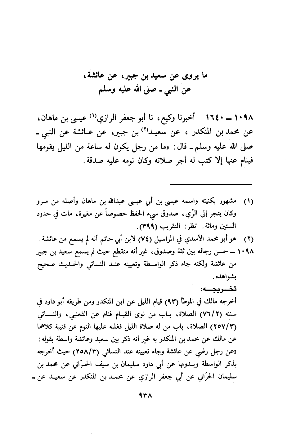 1640 - أَخْبَرَنَا وَكِيعٌ، نا أَبُو جَعْفَرٍ الرَّازِيُّ عِيسَى بْنُ مَاهَانَ، عَنْ مُحَمَّدِ بْنِ الْمُنْكَدِرِ، عَنْ سَعِيدِ بْنِ جُبَيْرٍ، عَنْ عَائِشَةَ، عَنِ النَّبِيِّ صَلَّى اللهُ عَلَيْهِ وَسَلَّمَ قَالَ: «§مَا مِنْ رَجُلٍ يَكُونُ لَهُ سَاعَةٌ مِنَ اللَّيْلِ يَقُومُهَا فَيَنَامُ عَنْهَا إِلَّا كُتِبَ لَهُ أَجْرُ صَلَاتِهِ وَكَانَ نَوْمُهُ عَلَيْهِ صَدَقَةً»
