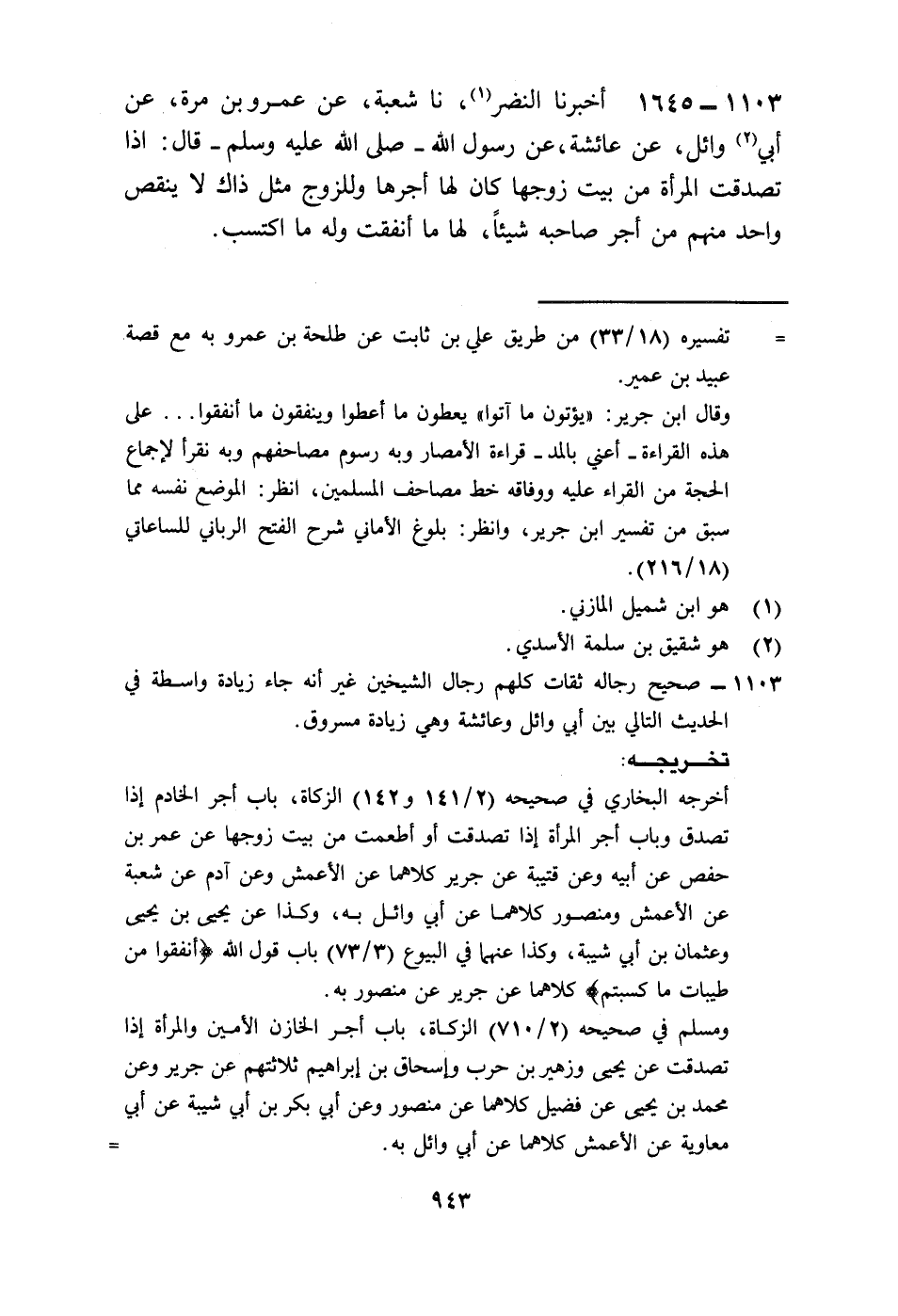 1645 - أَخْبَرَنَا النَّضْرُ، نا شُعْبَةُ، عَنْ عَمْرِو بْنِ مُرَّةَ، عَنْ أَبِي وَائِلٍ، عَنْ عَائِشَةَ، عَنْ رَسُولِ اللَّهِ صَلَّى اللهُ عَلَيْهِ وَسَلَّمَ قَالَ: «§إِذَا تَصَدَّقَتِ الْمَرْأَةُ مِنْ بَيْتِ زَوْجِهَا كَانَ لَهَا أَجْرُهَا وَلِلزَّوْجِ مِثْلُ ذَاكَ لَا يَنْقُصُ وَاحِدٌ مِنْهُمْ مِنْ أَجْرِ صَاحِبِهِ شَيْئًا لَهَا مَا أَنْفَقَتْ وَلَهُ مَا اكْتَسَبَ»