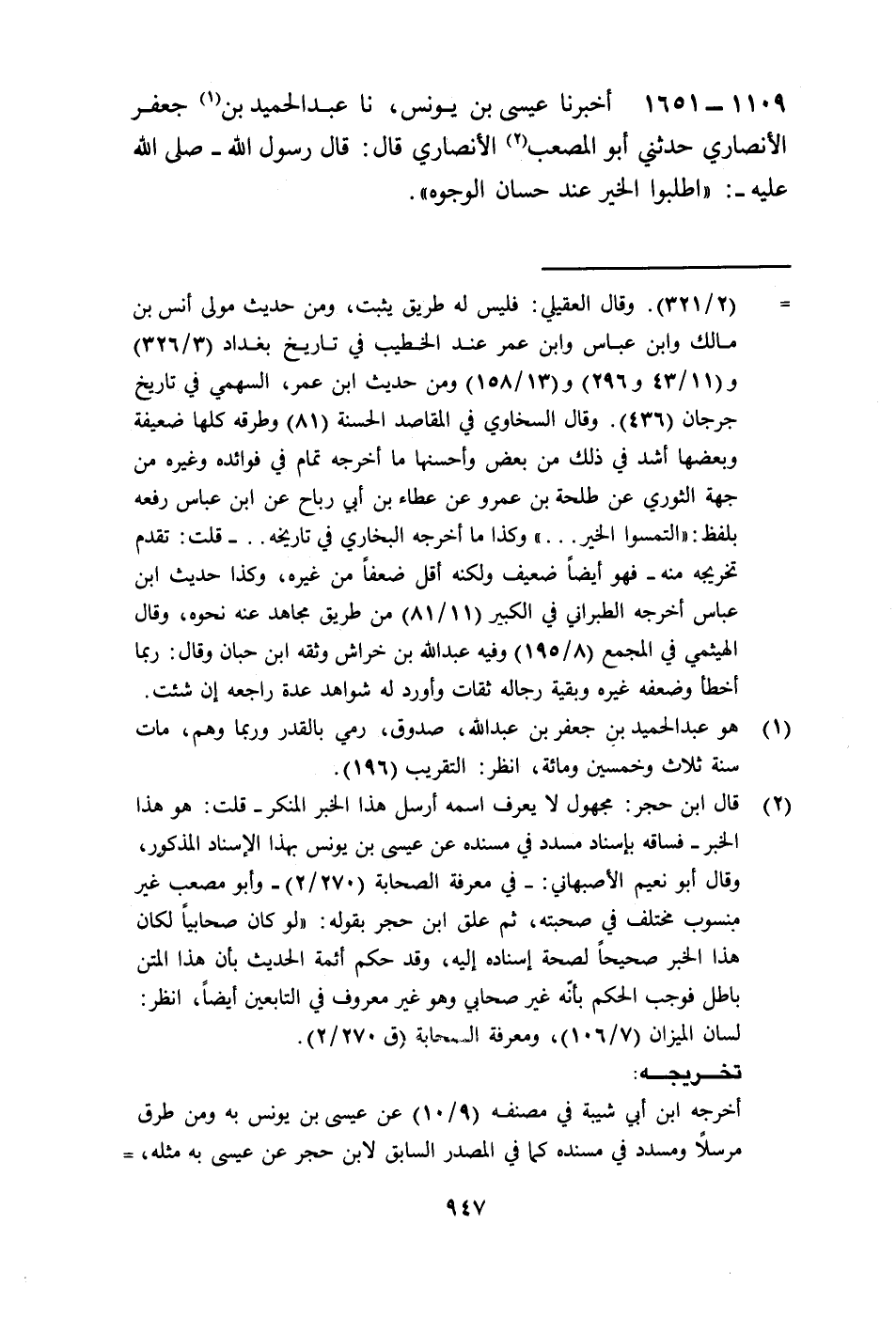 1651 - أَخْبَرَنَا عِيسَى بْنُ يُونُسَ، نا عَبْدُ الْحَمِيدِ بْنُ جَعْفَرٍ الْأَنْصَارِيُّ، حَدَّثَنِي أَبُو مُصْعَبٍ الْأَنْصَارِيُّ، قَالَ: قَالَ رَسُولُ اللَّهِ صَلَّى اللهُ عَلَيْهِ وَسَلَّمَ «§اطْلُبُوا الْخَيْرَ عِنْدَ حِسَانِ الْوُجُوهِ»