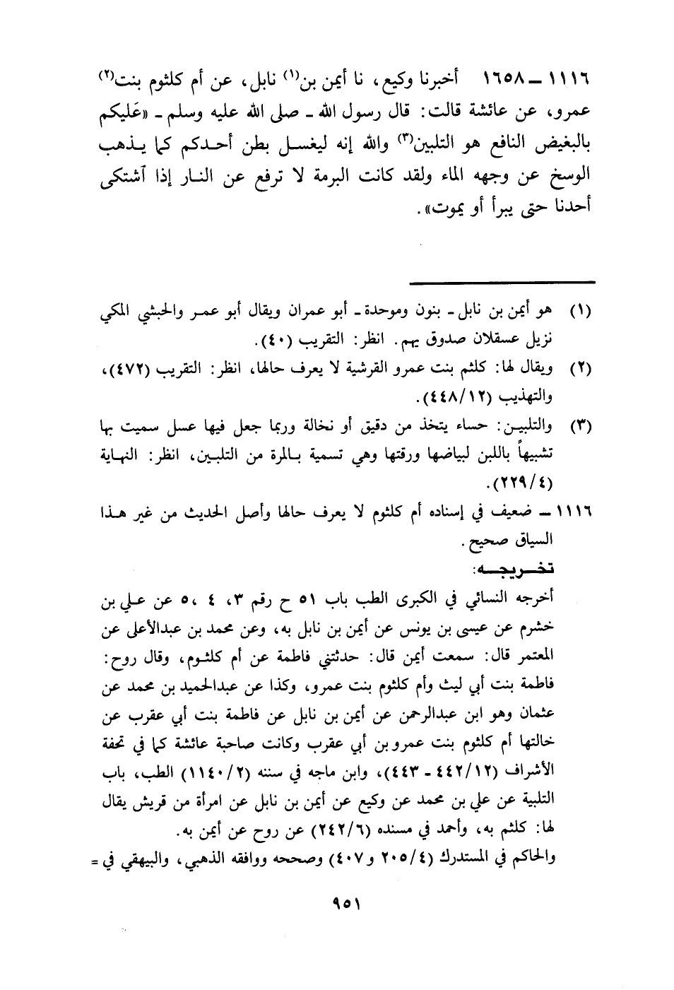 1658 - أَخْبَرَنَا وَكِيعٌ، نا أَيْمَنُ بْنُ نَابِلٍ، عَنْ أُمِّ كُلْثُومِ بِنْتِ عَمْرٍو، عَنْ عَائِشَةَ، قَالَتْ: قَالَ رَسُولُ اللَّهِ صَلَّى اللهُ عَلَيْهِ وَسَلَّمَ: «§عَلَيْكُمْ بِالْبَغِيضِ النَّافِعِ هُوَ التَّلْبِينُ، وَاللَّهِ أَنَّهُ لَيَغْسِلُ بَطْنَ أَحَدِكُمْ كَمَا يَذْهَبُ الْوَسَخَ عَنْ وَجْهِهِ الْمَاءُ، وَلَقَدْ كَانَتِ الْبُرْمَةُ لَا تُرْفَعُ عَنِ النَّارِ إِذَا اشْتَكَى أَحَدُنَا حَتَّى يَبْرَأَ أَوْ يَمُوتَ»