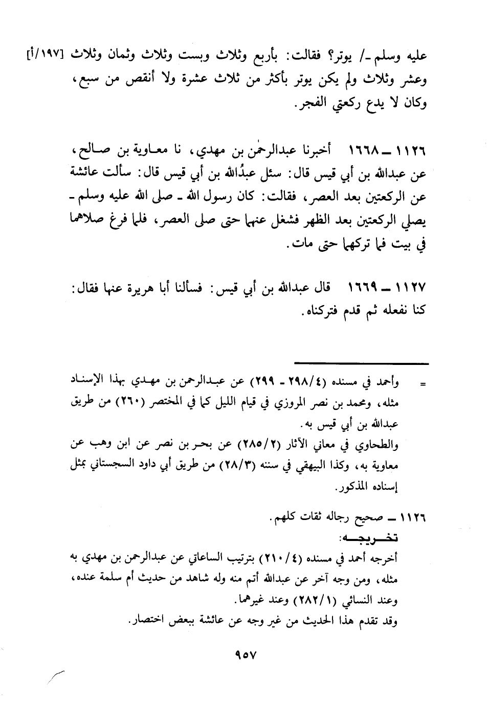 1668 - أَخْبَرَنَا عَبْدُ الرَّحْمَنِ بْنُ مَهْدِيٍّ، نا مُعَاوِيَةُ بْنُ صَالِحٍ، عَنْ عَبْدِ اللَّهِ بْنِ أَبِي قَيْسٍ قَالَ: سُئِلَ عَبْدُ اللَّهِ بْنُ أَبِي قَيْسٍ، قَالَ سَأَلْتُ عَائِشَةَ عَنِ الرَّكْعَتَيْنِ بَعْدَ الْعَصْرِ فَقَالَتْ: «كَانَ رَسُولُ اللَّهِ صَلَّى اللهُ عَلَيْهِ وَسَلَّمَ §يُصَلِّي الرَّكْعَتَيْنِ بَعْدَ الظُّهْرِ فَشُغِلَ عَنْهُمَا حَتَّى صَلَّى الْعَصْرَ فَلَمَّا فَرَغَ صَلَّاهُمَا فِي بَيْتٍ فَمَا تَرَكَهُمَا حَتَّى مَاتَ»