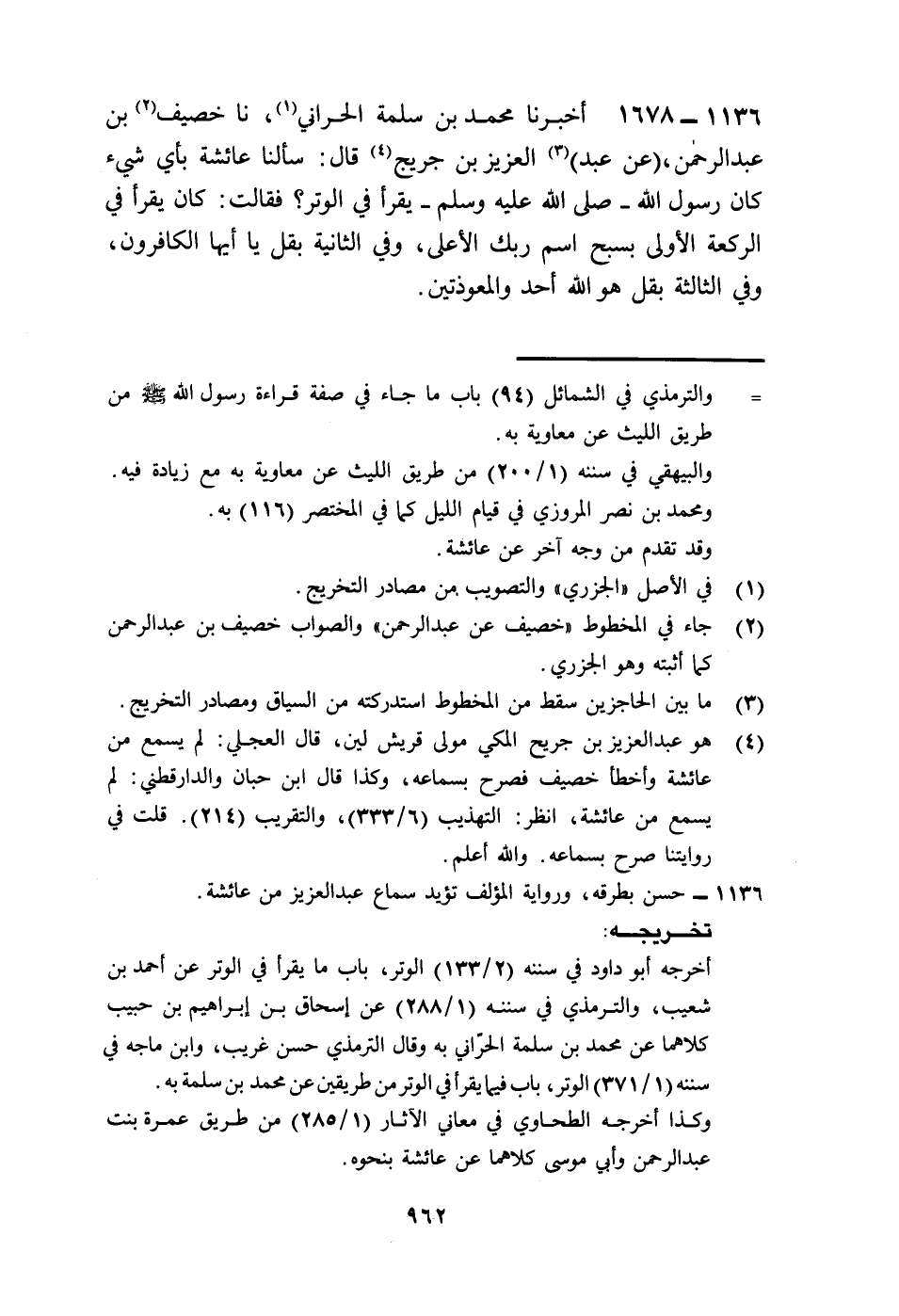 1678 - أَخْبَرَنَا مُحَمَّدُ بْنُ سَلَمَةَ الْحَرَّانِيُّ، نا خُصَيْفُ بْنُ عَبْدِ الرَّحْمَنِ، عَنْ عَبْدِ الْعَزِيزِ بْنِ جُرَيْجٍ، قَالَ: سَأَلْنَا عَائِشَةَ بِأَيِّ شَيْءٍ كَانَ رَسُولُ اللَّهِ صَلَّى اللهُ عَلَيْهِ وَسَلَّمَ يَقْرَأُ فِي الْوِتْرِ؟ فَقَالَتْ: «§كَانَ يَقْرَأُ فِي الرَّكْعَةِ الْأُولَى بِسَبِّحِ اسْمَ رَبِّكَ الْأَعَلَى وَفِي الثَّانِيَةِ بِقُلْ يَا أَيُّهَا الْكَافِرُونَ وَفِي الثَّالِثَةِ بِقُلْ هُوَ اللَّهُ أَحَدٌ وَالْمُعَوَّذَتَيْنِ»
