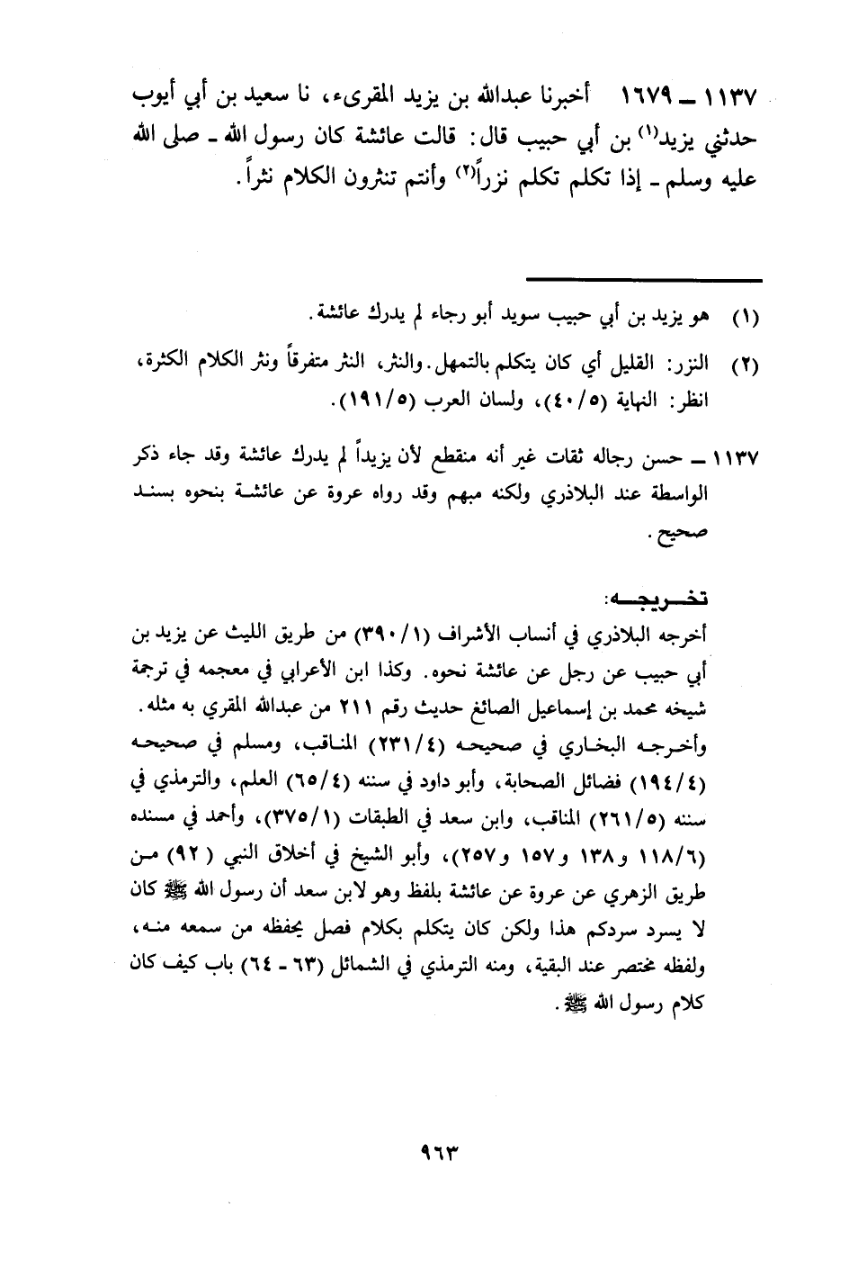 1679 - أَخْبَرَنَا عَبْدُ اللَّهِ بْنُ يَزِيدَ الْمُقْرِئُ، نا سَعِيدُ بْنُ أَبِي أَيُّوبَ، حَدَّثَنِي يَزِيدُ بْنُ أَبِي حَبِيبٍ، قَالَ: قَالَتْ عَائِشَةُ: «كَانَ رَسُولُ اللَّهِ صَلَّى اللهُ عَلَيْهِ وَسَلَّمَ §إِذَا تَكَلَّمَ تَكَلَّمَ نَزْرًا وَأَنْتُمْ تَنْثُرُونَ الْكَلَامَ نَثْرًا»