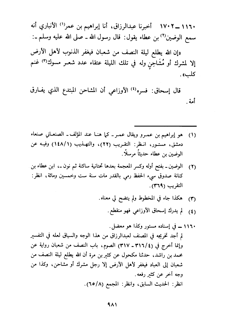 1702 - أَخْبَرَنَا عَبْدُ الرَّزَّاقِ، أنا إِبْرَاهِيمُ بْنُ عُمَرَ الْأَنْبَارِيُّ، أَنَّهُ سَمِعَ الْوَضِينَ بْنَ عَطَاءٍ، يَقُولُ: قَالَ رَسُولُ اللَّهِ صَلَّى اللهُ عَلَيْهِ وَسَلَّمَ: «إِنَّ §اللَّهَ يَطَّلِعُ لَيْلَةَ النِّصْفِ مِنْ شَعْبَانَ فَيَغْفِرُ الذُّنُوبَ لِأَهْلِ الْأَرْضِ إِلَّا لِمُشْرِكٍ أَوْ مُشَاحِنٍ وَلَهُ فِي تِلْكَ اللَّيْلَةِ عُتَقَاءُ عَدَدُ شَعَرِ مُسُوكِ غَنَمِ كَلْبٍ» . قَالَ إِسْحَاقُ: فَسَّرَهُ الْأَوْزَاعِيُّ أَنَّ الْمُشَاحِنَ الْمُبْتَدِعَ الَّذِي يُفَارِقُ أُمَّةً