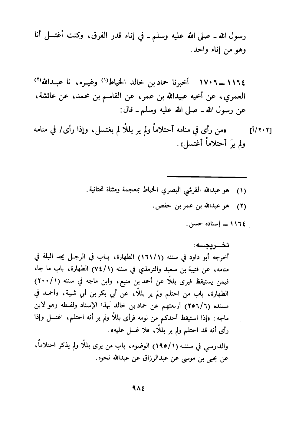 1706 - أَخْبَرَنَا حَمَّادُ بْنُ خَالِدٍ الْخَيَّاطُ، وَغَيْرُهُ، نا عَبْدُ اللَّهِ الْعُمَرِيُّ، عَنْ أَخِيهِ، عُبَيْدِ اللَّهِ بْنِ عُمَرَ، عَنِ الْقَاسِمِ بْنِ مُحَمَّدٍ، عَنْ عَائِشَةَ، عَنْ رَسُولِ اللَّهِ صَلَّى اللهُ عَلَيْهِ وَسَلَّمَ قَالَ: «§مَنْ رَأَى فِي مَنَامِهِ احْتِلَامًا وَلَمْ يَرَ بَلَلًا لَمْ يَغْتَسِلْ، وَإِذَا رَأَى فِي مَنَامِهِ وَلَمْ يَرَ احْتِلَامًا اغْتَسَلَ»