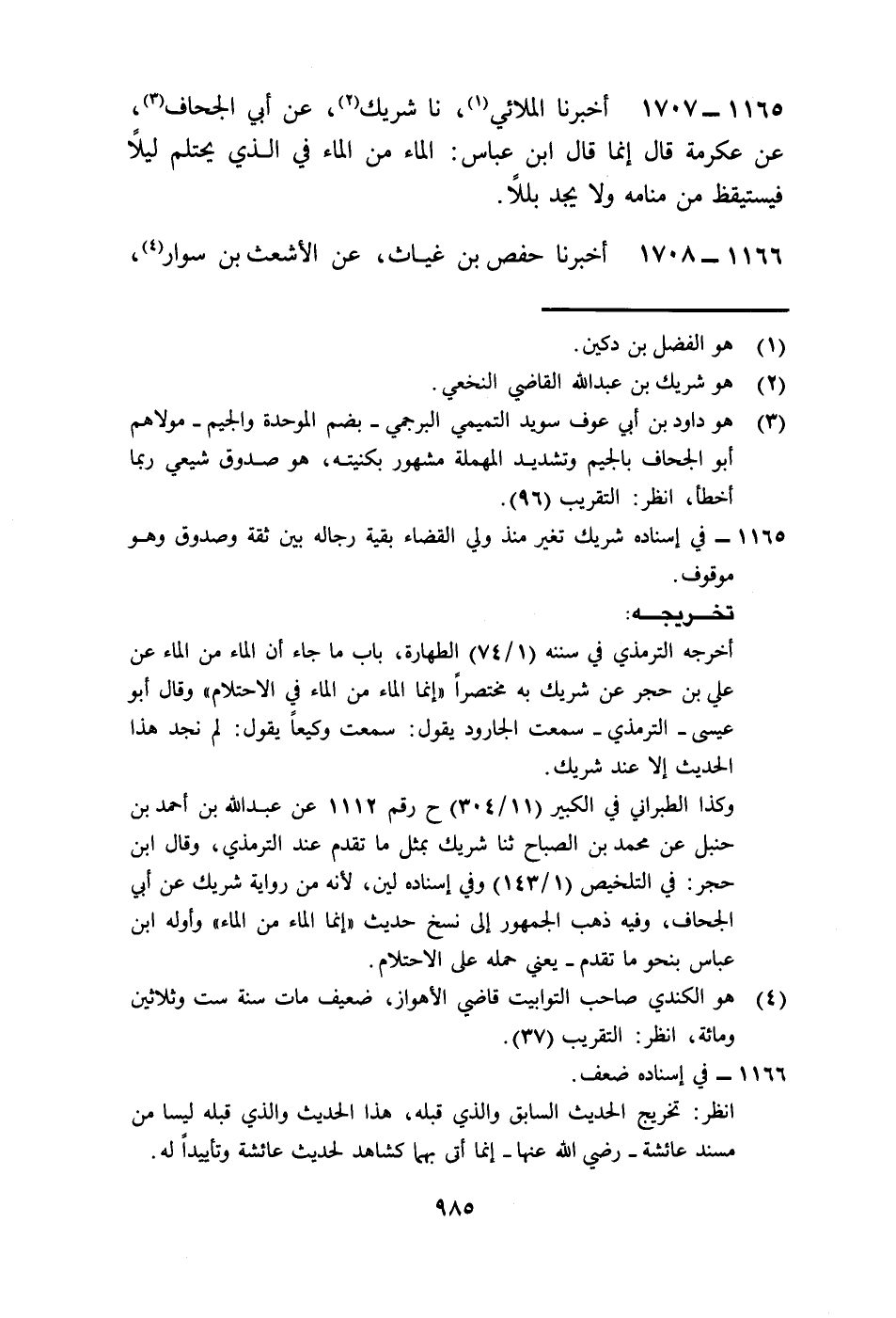 1707 - أَخْبَرَنَا الْمُلَائِيُّ، نا شَرِيكٌ، عَنْ أَبِي الْجَحَّافِ، عَنْ عِكْرِمَةَ، قَالَ: إِنَّمَا قَالَ ابْنُ عَبَّاسٍ: «§الْمَاءُ مِنَ الْمَاءِ فِي الَّذِي يَحْتَلِمُ لَيْلًا فَيَسْتَيْقِظُ مِنْ مَنَامِهِ وَلَا يَجِدُ بَلَلًا»