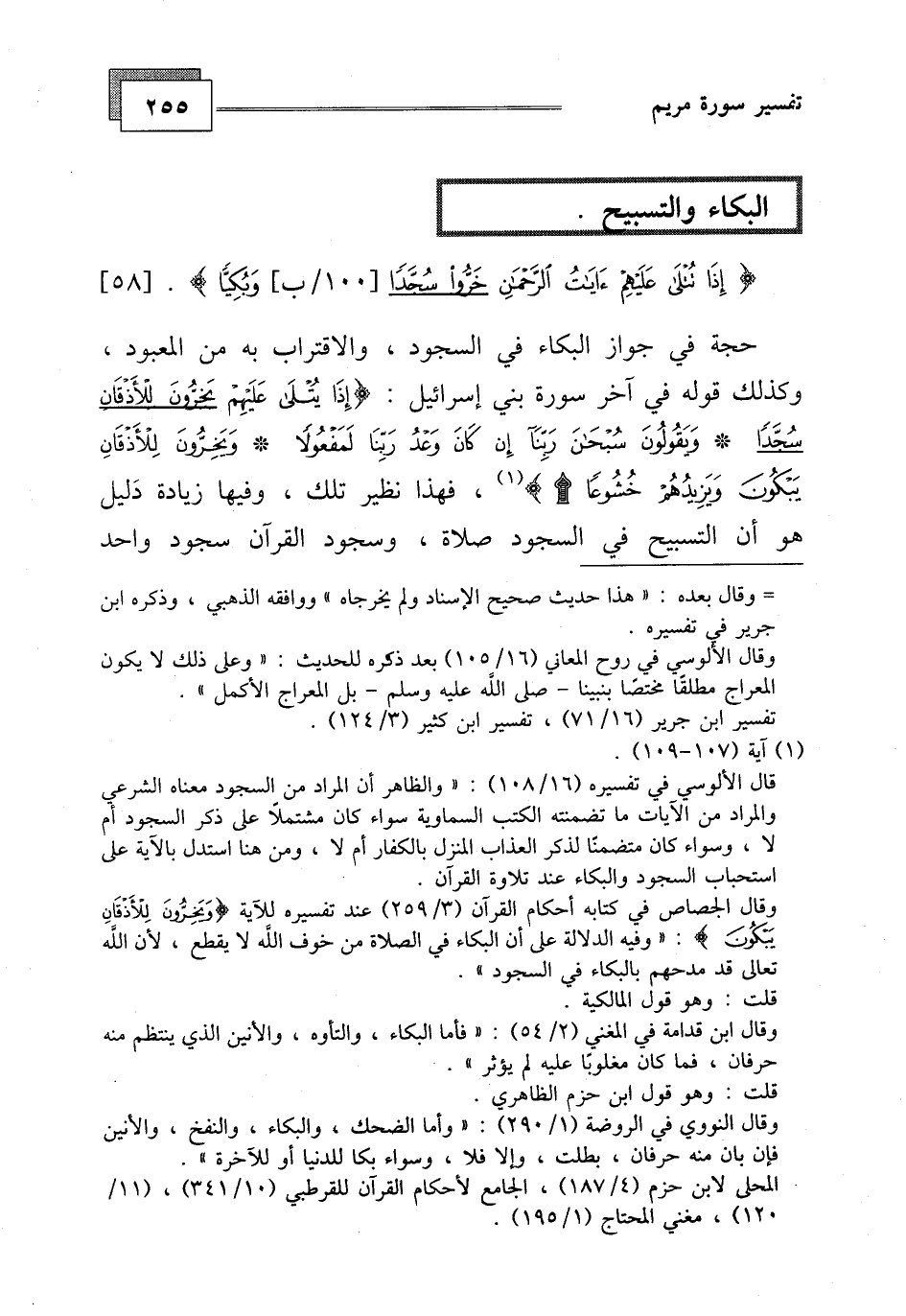 وكذلك قوله في آخر سورة بني إسرائيل: (إِذَا يُتْلَى عَلَيْهِمْ يَخِرُّونَ لِلْأَذْقَانِ سُجَّدًا (107) وَيَقُولُونَ سُبْحَانَ رَبِّنَا إِنْ كَانَ وَعْدُ رَبِّنَا لَمَفْعُولًا (108) وَيَخِرُّونَ لِلْأَذْقَانِ يَبْكُونَ وَيَزِيدُهُمْ خُشُوعًا (109) .