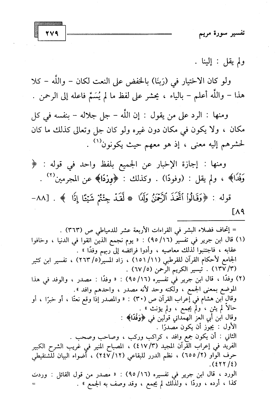ومنها: إجازة الإخبار عن الجميع بلفظ واحد في قوله: (وَفْدًا) ، ولم يقل: (وفودا) . وكذلك: (وِرْدَا) عن المجرمين.