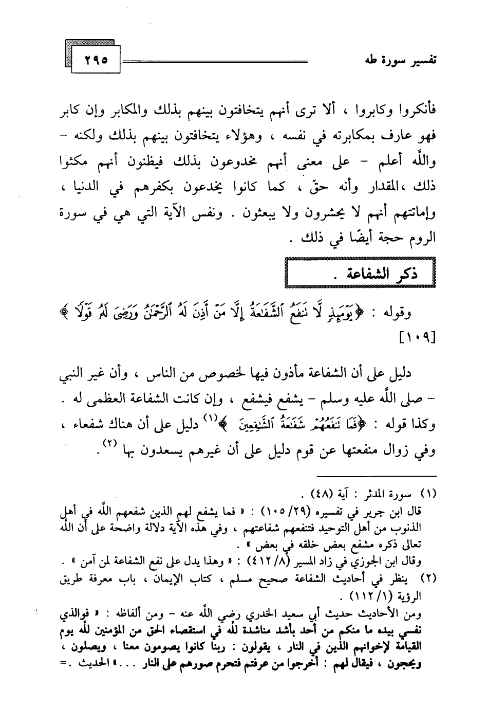 وقوله: (يَوْمَئِذٍ لَا تَنْفَعُ الشَّفَاعَةُ إِلَّا مَنْ أَذِنَ لَهُ الرَّحْمَنُ وَرَضِيَ لَهُ قَوْلًا (109)