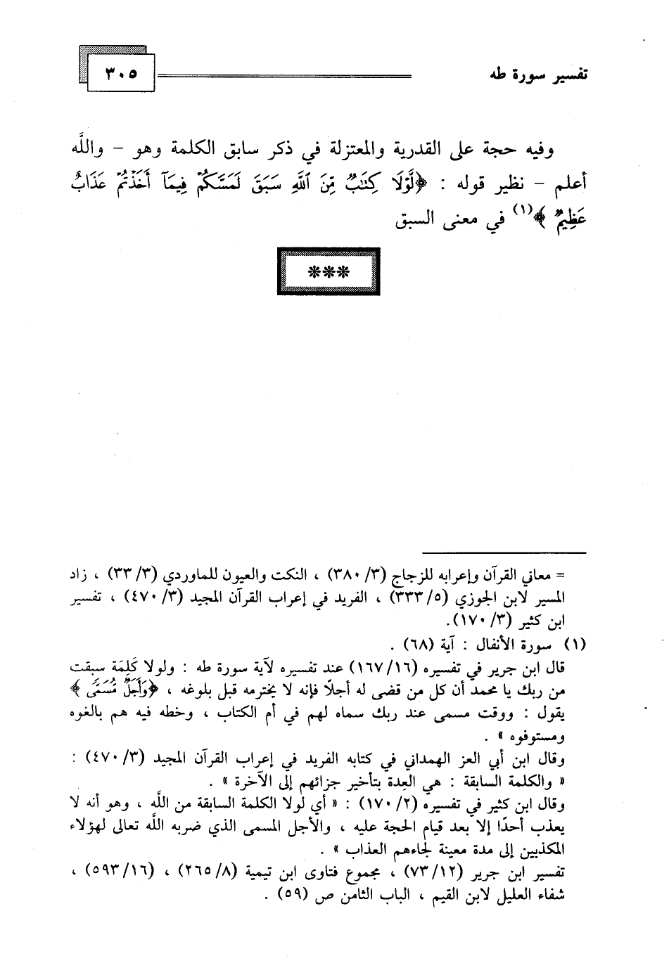 أعلم - نظير قوله: (لَوْلَا كِتَابٌ مِنَ اللَّهِ سَبَقَ لَمَسَّكُمْ فِيمَا أَخَذْتُمْ عَذَابٌ عَظِيمٌ (68)