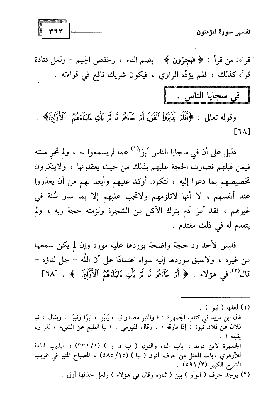 وقوله تعالى: (أَفَلَمْ يَدَّبَّرُوا الْقَوْلَ أَمْ جَاءَهُمْ مَا لَمْ يَأْتِ آبَاءَهُمُ الْأَوَّلِينَ (68)