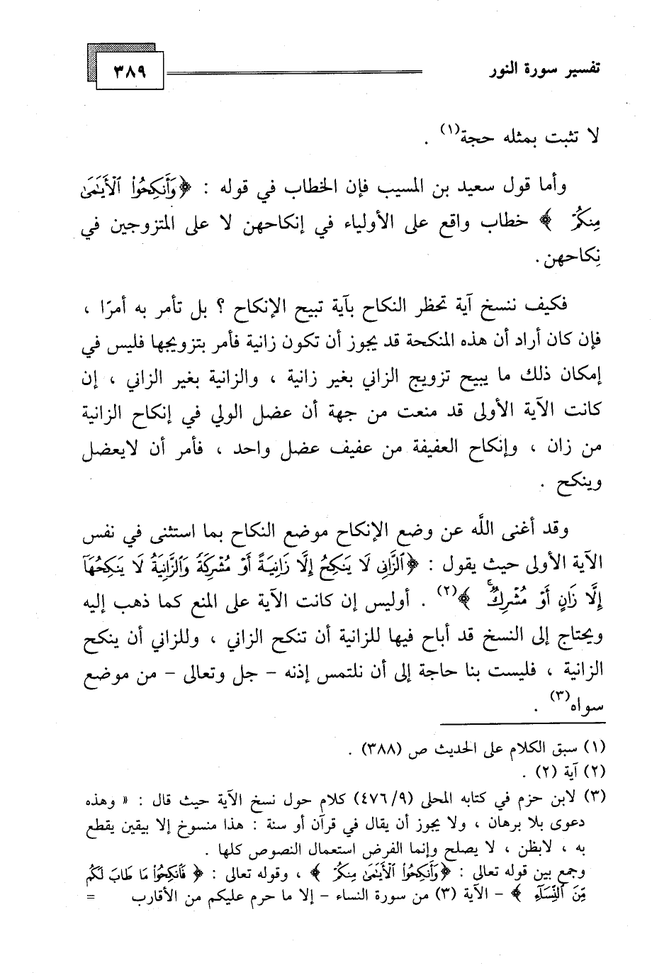 الآية الأولى حيث يقول: (الزَّانِي لَا يَنْكِحُ إِلَّا زَانِيَةً أَوْ مُشْرِكَةً وَالزَّانِيَةُ لَا يَنْكِحُهَا إِلَّا زَانٍ أَوْ مُشْرِكٌ) .