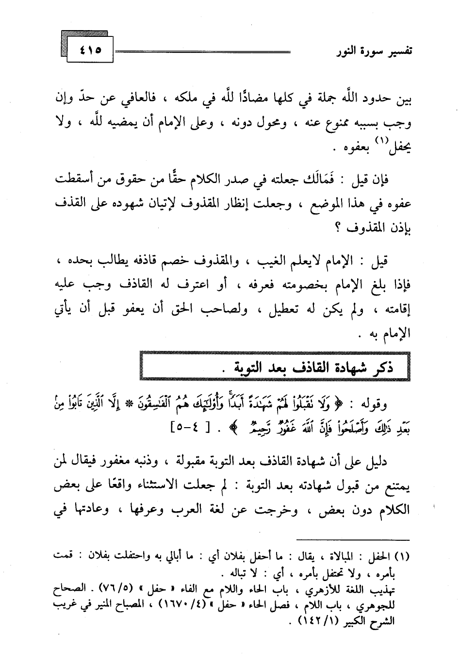 وقوله: (وَلَا تَقْبَلُوا لَهُمْ شَهَادَةً أَبَدًا وَأُولَئِكَ هُمُ الْفَاسِقُونَ (4) إِلَّا الَّذِينَ تَابُوا مِنْ بَعْدِ ذَلِكَ وَأَصْلَحُوا فَإِنَّ اللَّهَ غَفُورٌ رَحِيمٌ (5)