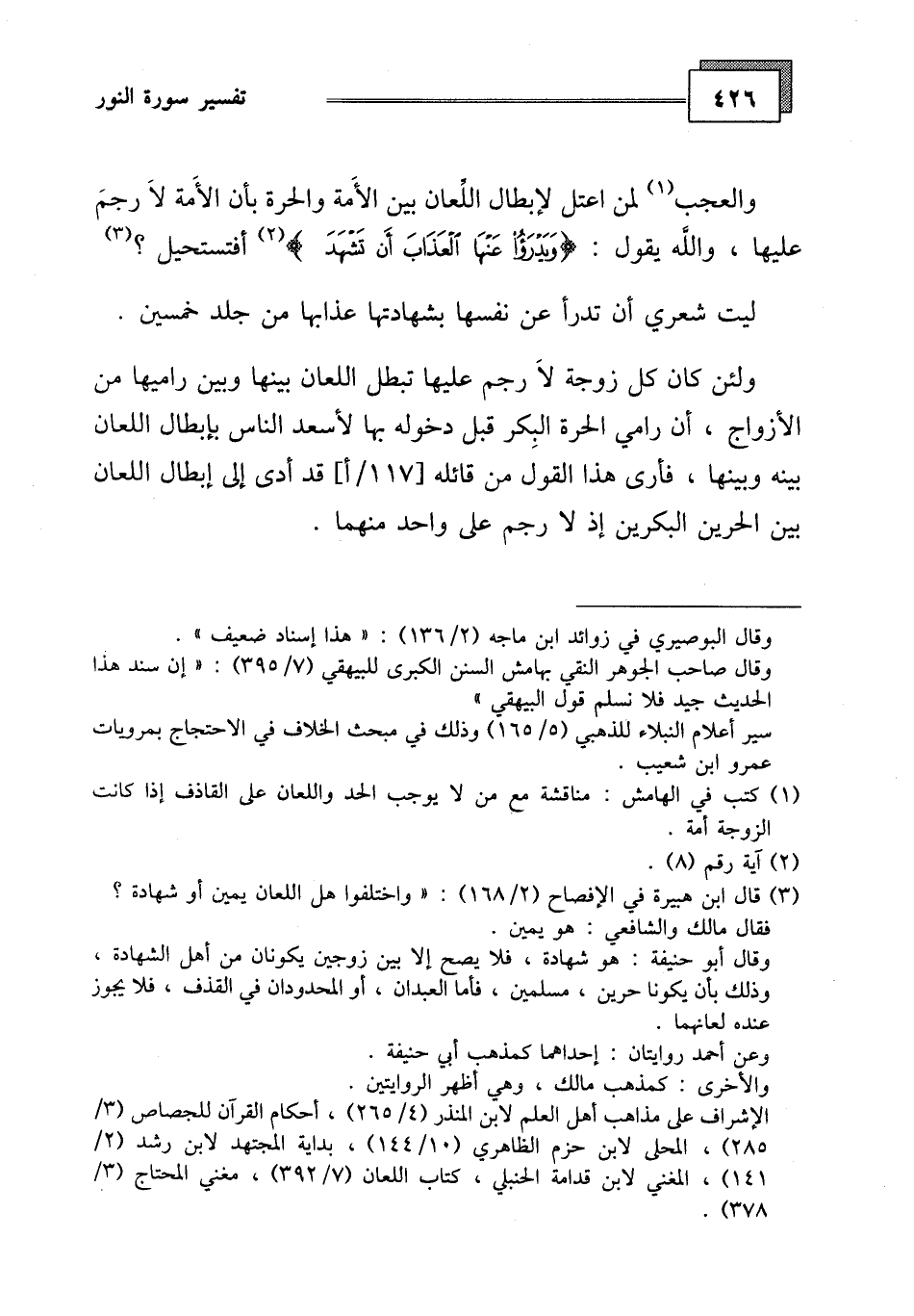 والعجب لمن اعتل لإبطال اللعان بين الأَمة والحرة بأن الأَمة لا رجمَ