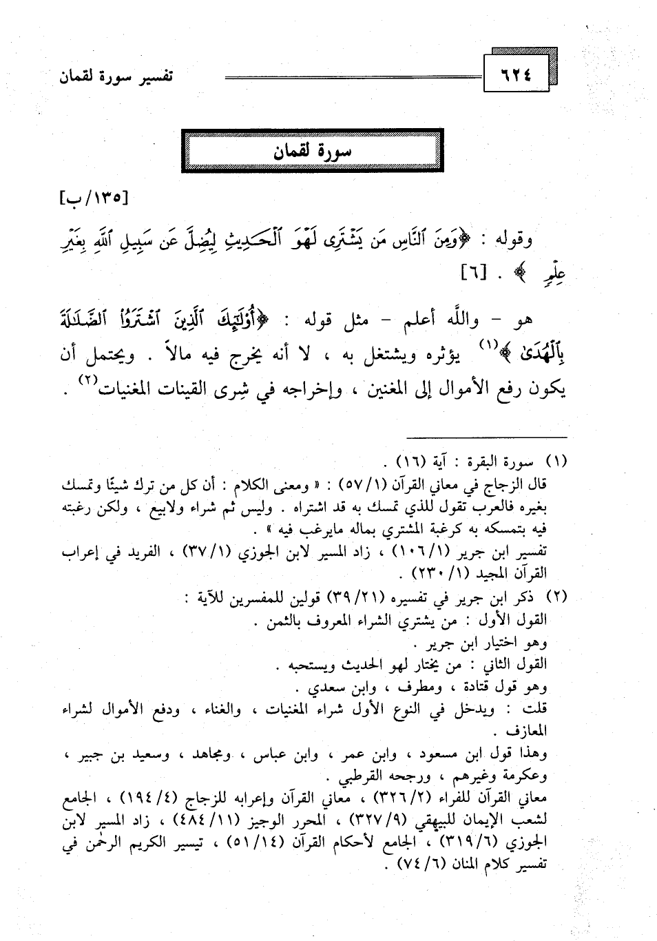 وقوله: (وَمِنَ النَّاسِ مَنْ يَشْتَرِي لَهْوَ الْحَدِيثِ لِيُضِلَّ عَنْ سَبِيلِ اللَّهِ بِغَيْرِ عِلْمٍ)
