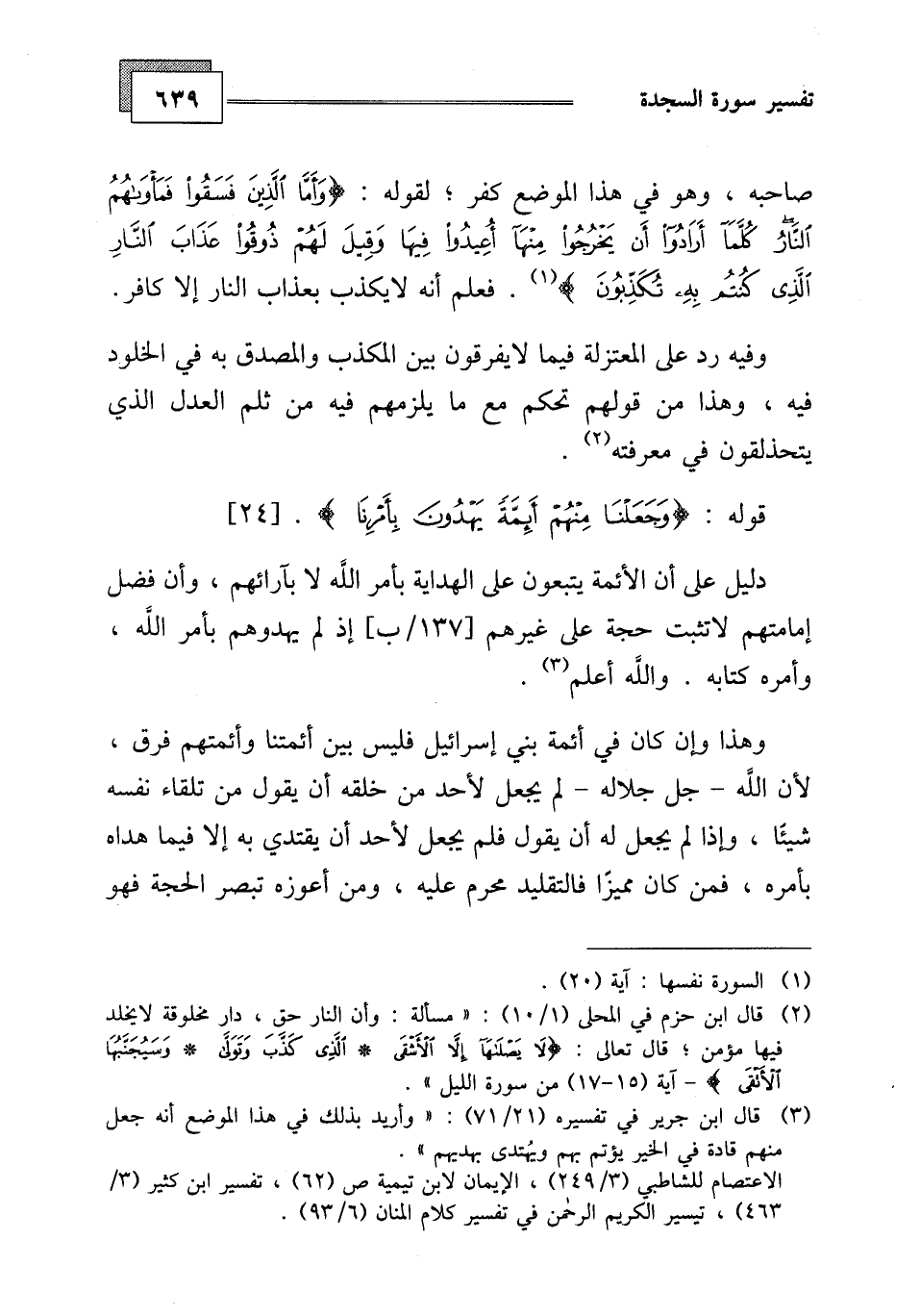 قوله: (وَجَعَلْنَا مِنْهُمْ أَئِمَّةً يَهْدُونَ بِأَمْرِنَا)