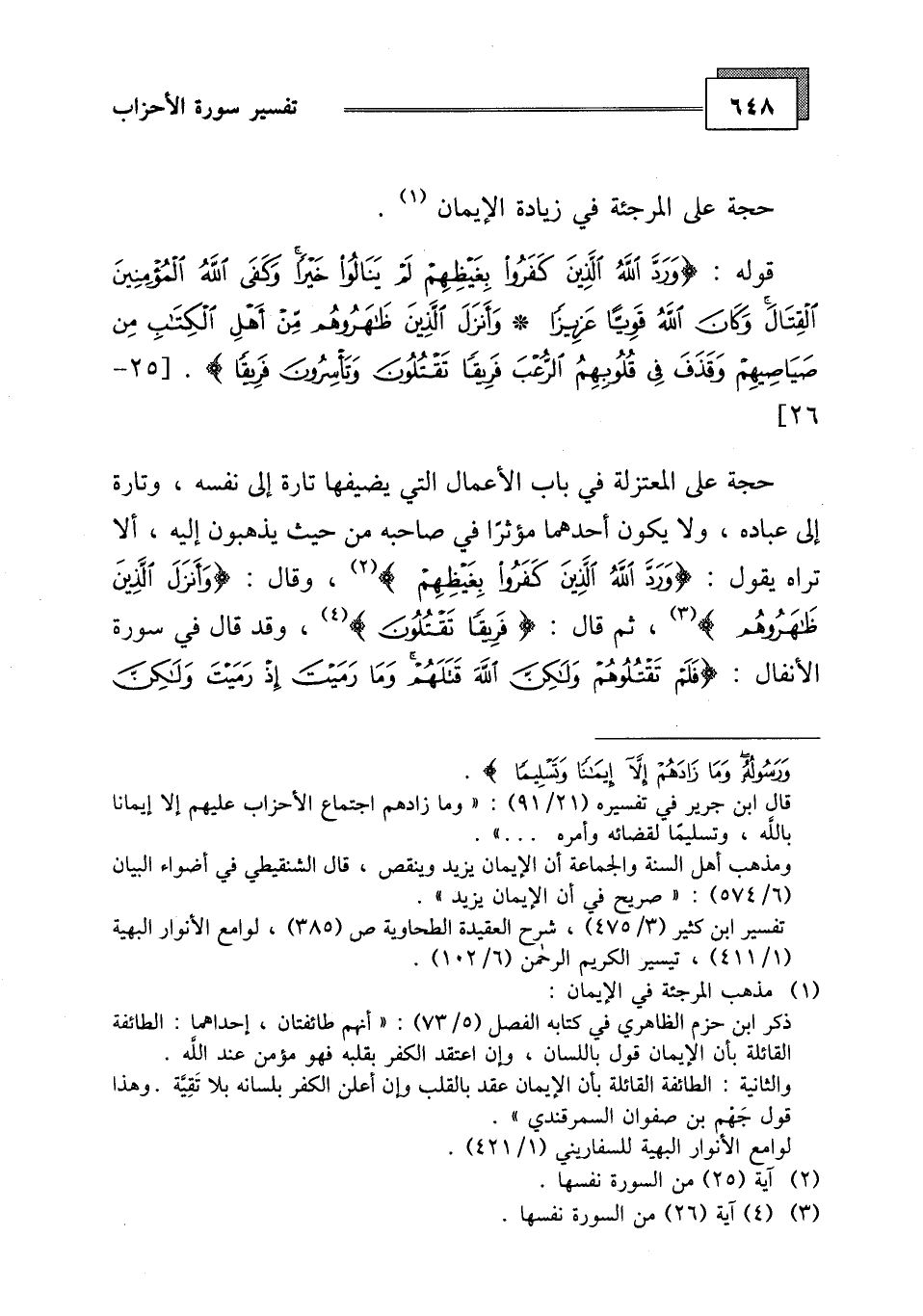 تراه يقول: (وَرَدَّ اللَّهُ الَّذِينَ كَفَرُوا بِغَيْظِهِمْ) ، وقال: (وَأَنْزَلَ الَّذِينَ ظَاهَرُوهُمْ) ، ثم قال: (فَرِيقًا تَقْتُلُونَ) ، وقد قال في سورة