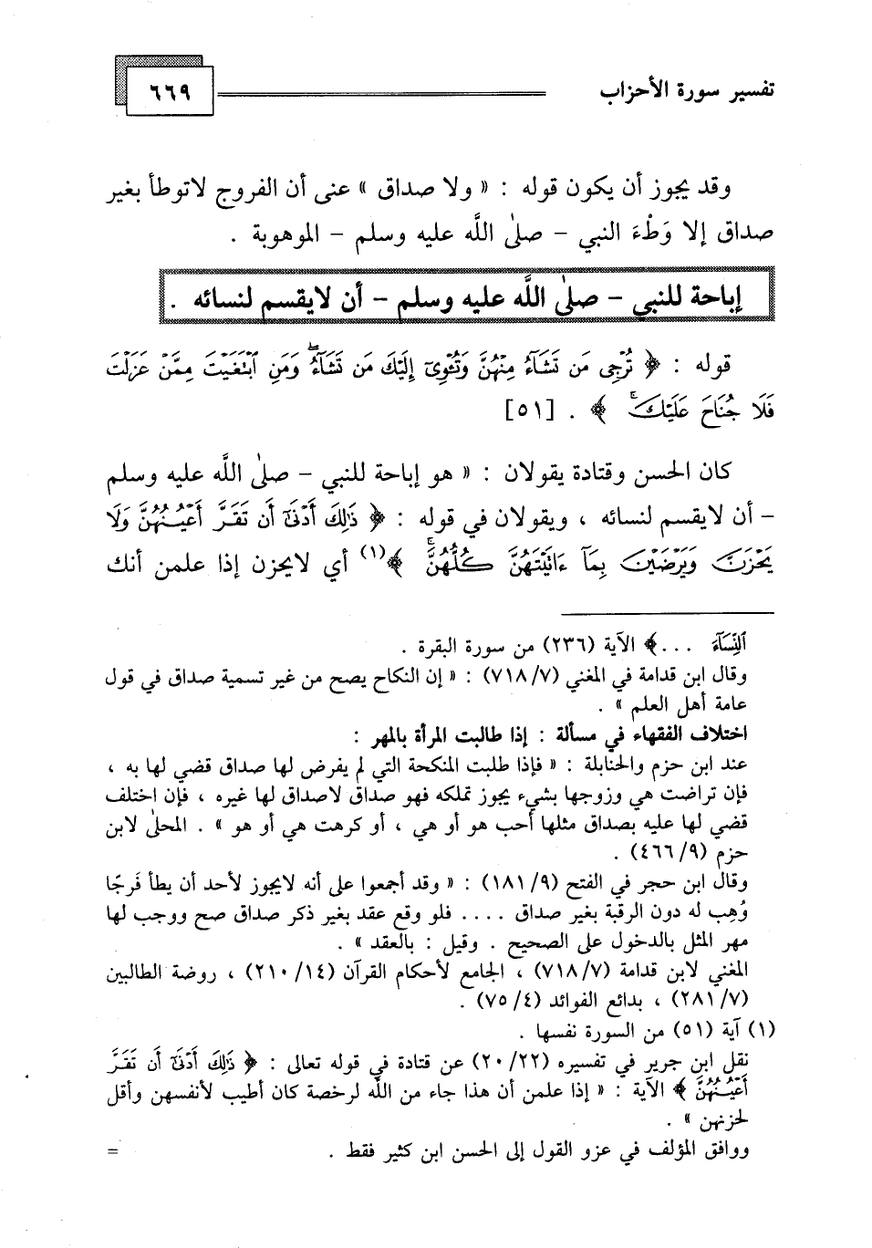 - أن لايقسم لنسائه، ويقولان في قوله: (ذَلِكَ أَدْنَى أَنْ تَقَرَّ أَعْيُنُهُنَّ وَلَا يَحْزَنَّ وَيَرْضَيْنَ بِمَا آتَيْتَهُنَّ كُلُّهُنَّ) أي لا يحزن إذا علمن أنك