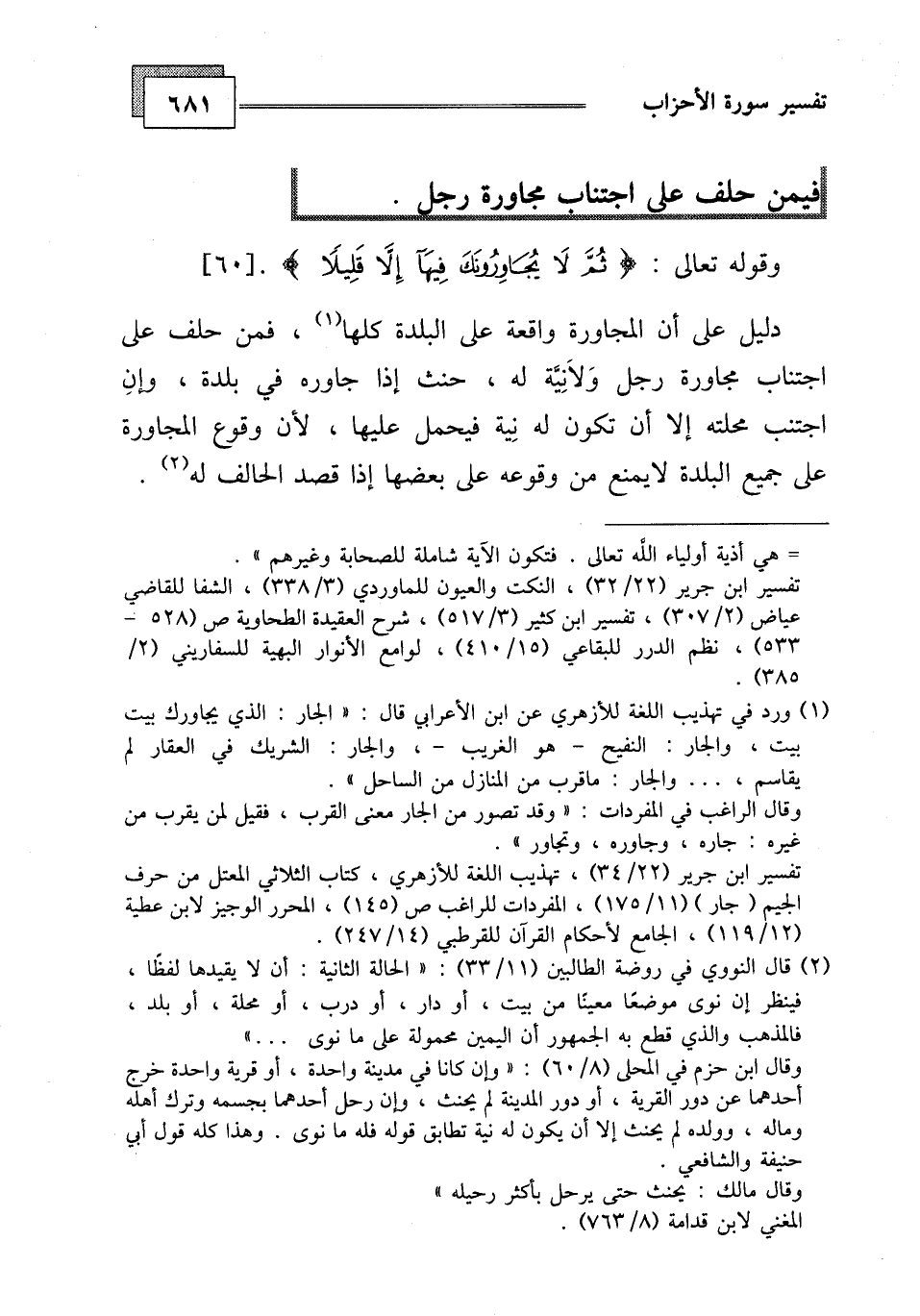 دليل على أن المجاورة واقعة على البلدة كلها، فمن حلف على