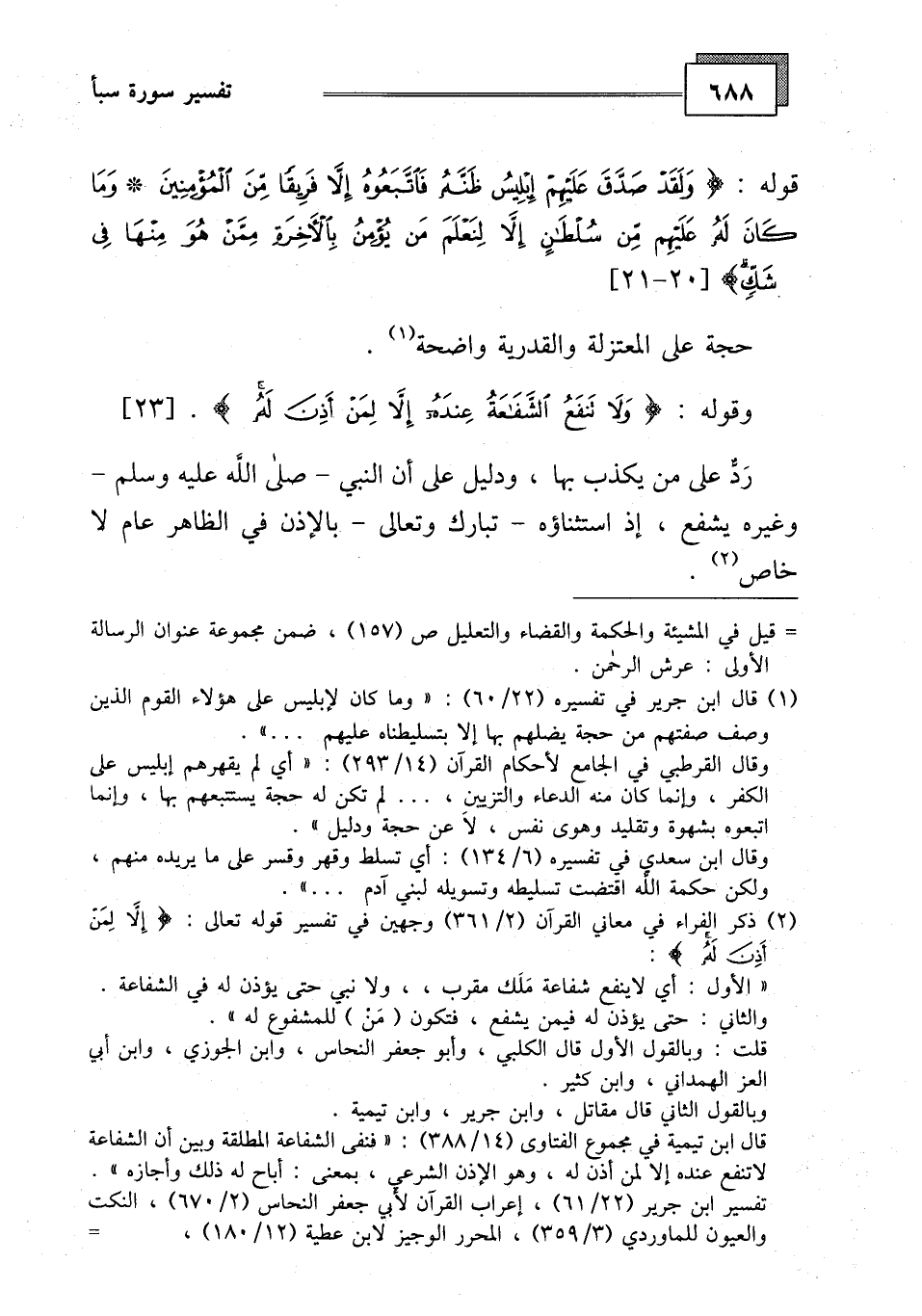 قوله: (وَلَقَدْ صَدَّقَ عَلَيْهِمْ إِبْلِيسُ ظَنَّهُ فَاتَّبَعُوهُ إِلَّا فَرِيقًا مِنَ الْمُؤْمِنِينَ (20) وَمَا كَانَ لَهُ عَلَيْهِمْ مِنْ سُلْطَانٍ إِلَّا لِنَعْلَمَ مَنْ يُؤْمِنُ بِالْآخِرَةِ مِمَّنْ هُوَ مِنْهَا فِي شَكٍّ)
