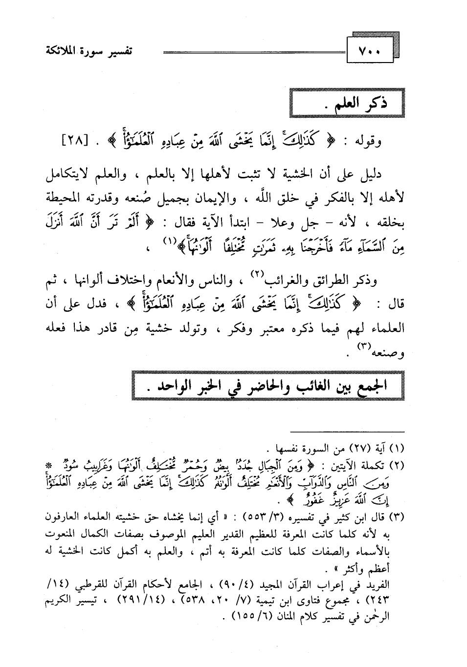 وقوله: (كَذَلِكَ إِنَّمَا يَخْشَى اللَّهَ مِنْ عِبَادِهِ الْعُلَمَاءُ)