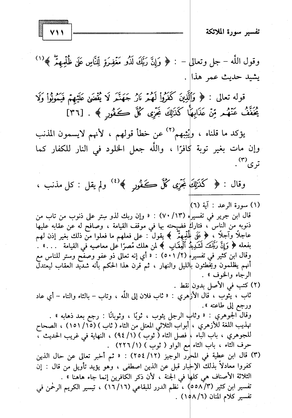 قوله تعالى: (وَالَّذِينَ كَفَرُوا لَهُمْ نَارُ جَهَنَّمَ لَا يُقْضَى عَلَيْهِمْ فَيَمُوتُوا وَلَا يُخَفَّفُ عَنْهُمْ مِنْ عَذَابِهَا كَذَلِكَ نَجْزِي كُلَّ كَفُورٍ (36)