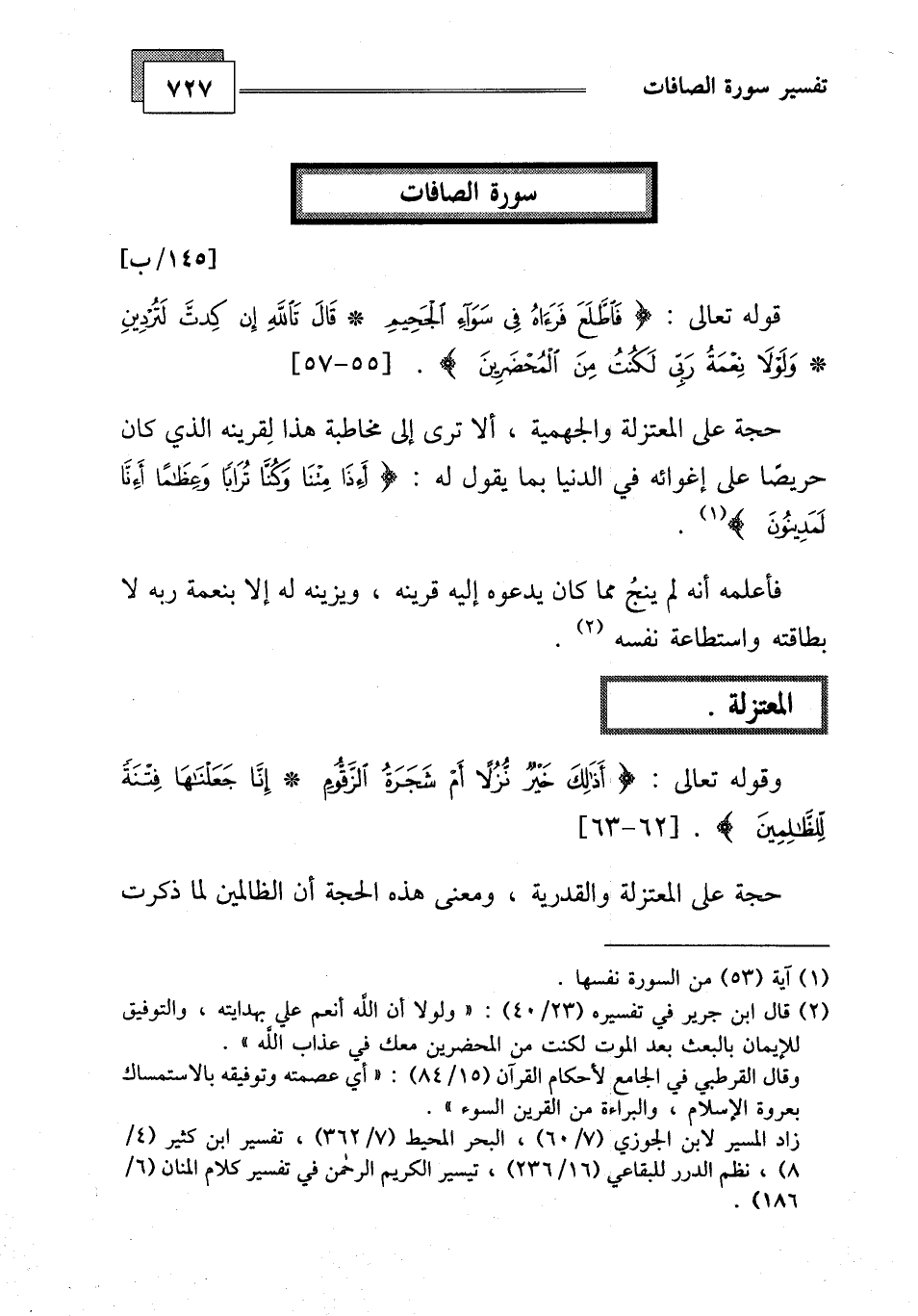 قوله تعالى: (فَاطَّلَعَ فَرَآهُ فِي سَوَاءِ الْجَحِيمِ (55) قَالَ تَاللَّهِ إِنْ كِدْتَ لَتُرْدِينِ (56) وَلَوْلَا نِعْمَةُ رَبِّي لَكُنْتُ مِنَ الْمُحْضَرِينَ (57)