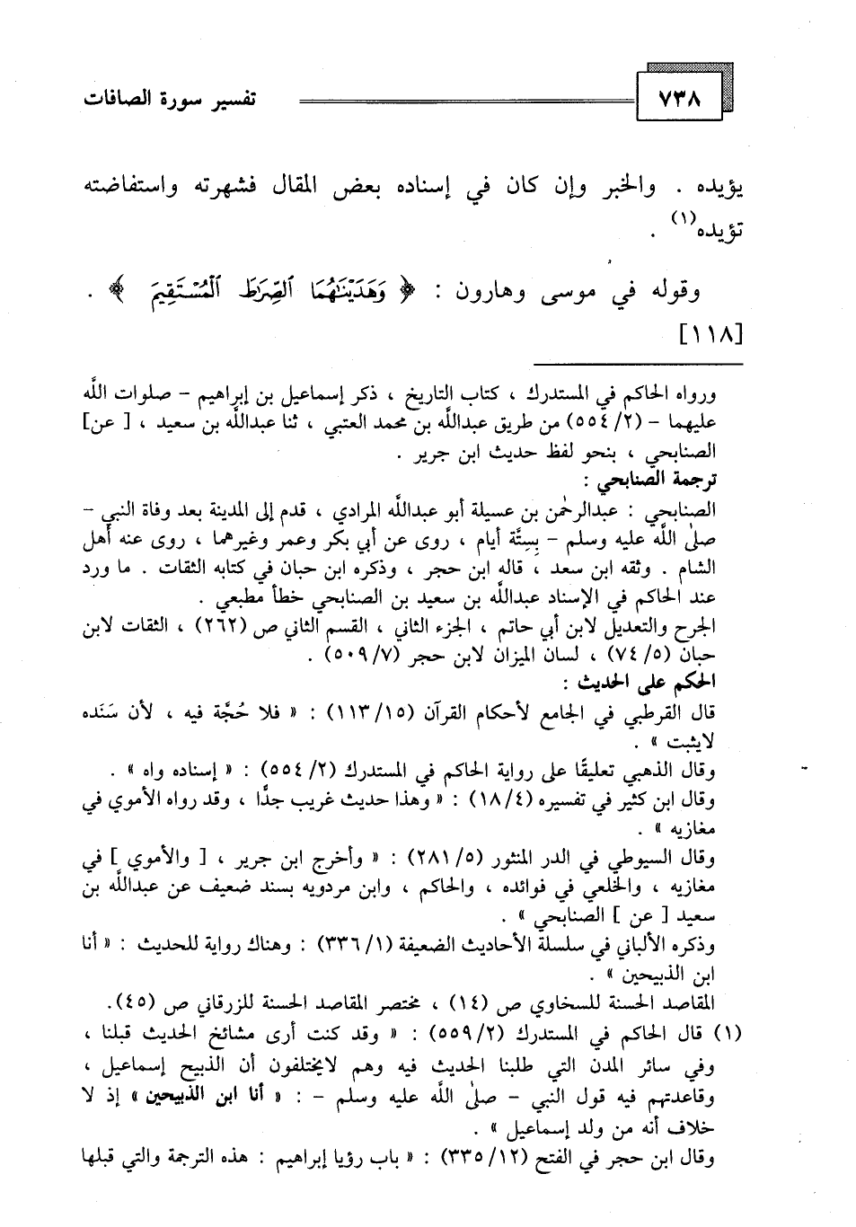 وقوله في موسى وهارون: (وَهَدَيْنَاهُمَا الصِّرَاطَ الْمُسْتَقِيمَ (118) .