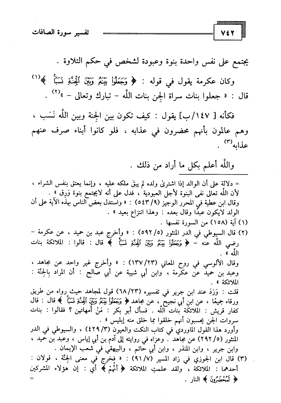 قال: " جعلوا بنات سراة الجِن بنات الله - تبارك وتعالى - ".