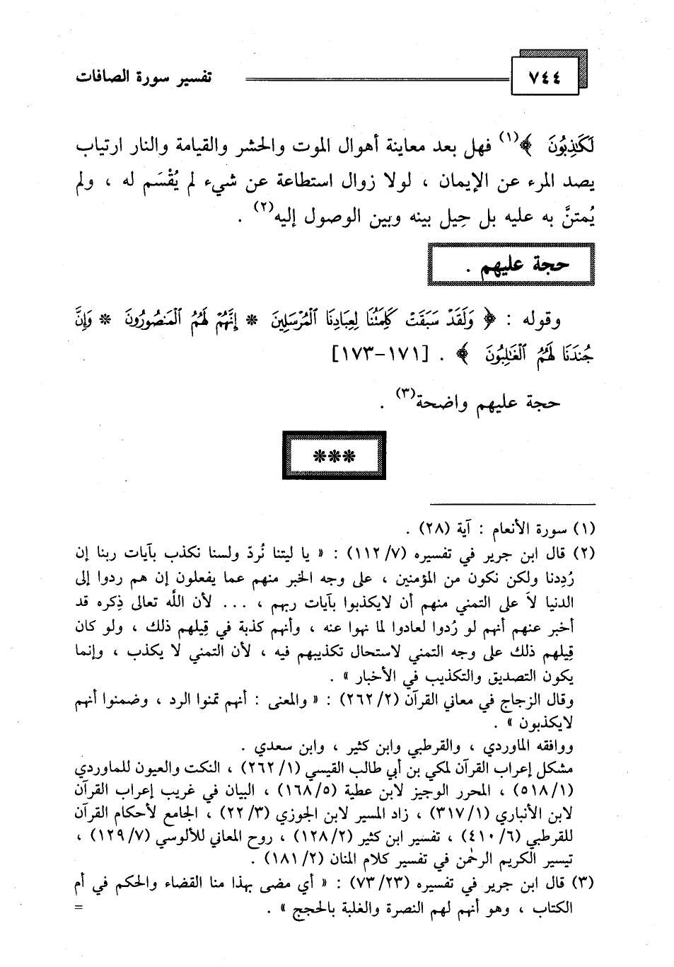 وقوله: (وَلَقَدْ سَبَقَتْ كَلِمَتُنَا لِعِبَادِنَا الْمُرْسَلِينَ (171) إِنَّهُمْ لَهُمُ الْمَنْصُورُونَ (172) وَإِنَّ جُنْدَنَا لَهُمُ الْغَالِبُونَ (173)
