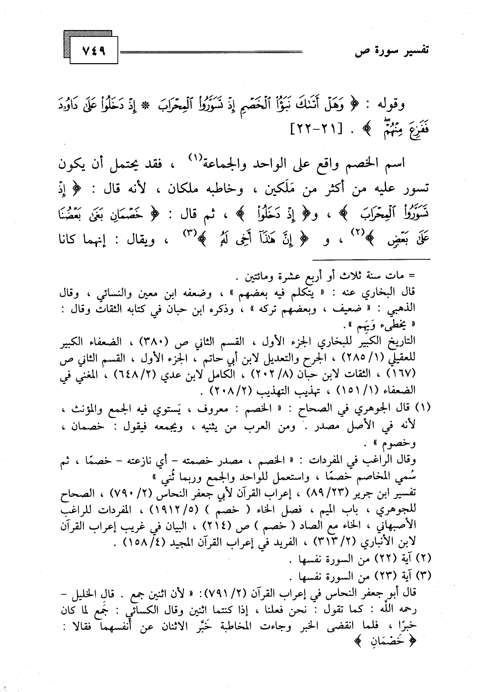 تسور عليه من أكثر من مَلَكين، وخاطبه ملكان، لأنه قال: (إِذْ تَسَوَّرُوا الْمِحْرَابَ) ، و (إِذْ دَخَلُوا) ، ثم قال: (خَصْمَانِ بَغَى بَعْضُنَا عَلَى بَعْضٍ)