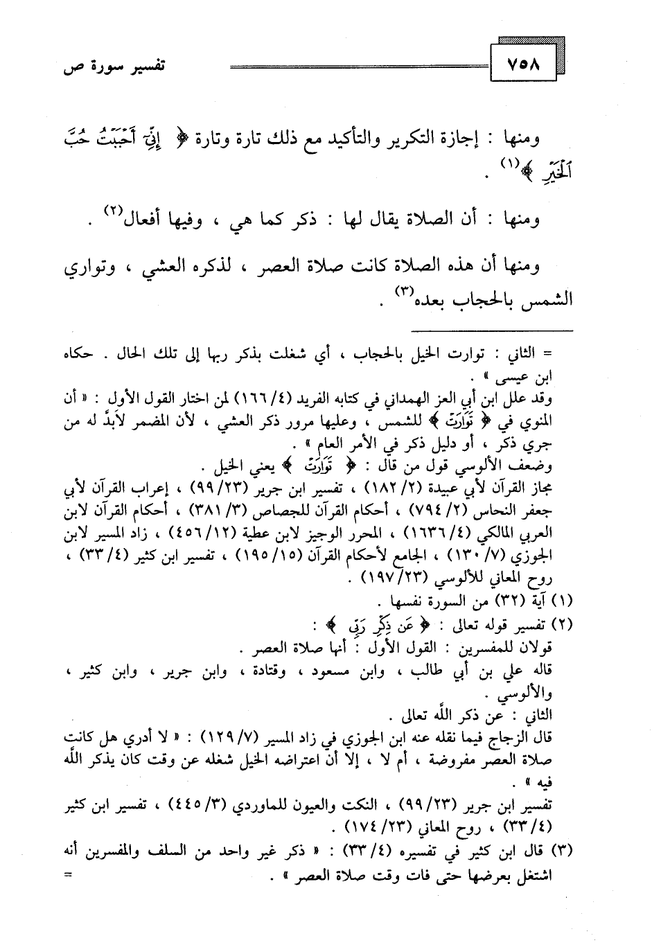 ومنها أن هذه الصلاة كانت صلاة العصر، لذكره العشي، وتواري