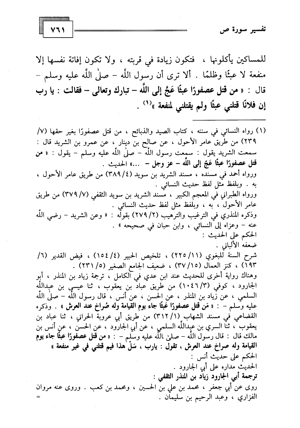 قال: " من قتل عصفورًا عبثًا عَجَّ إلى الله - تبارك وتعالى - فقالت: يا رب