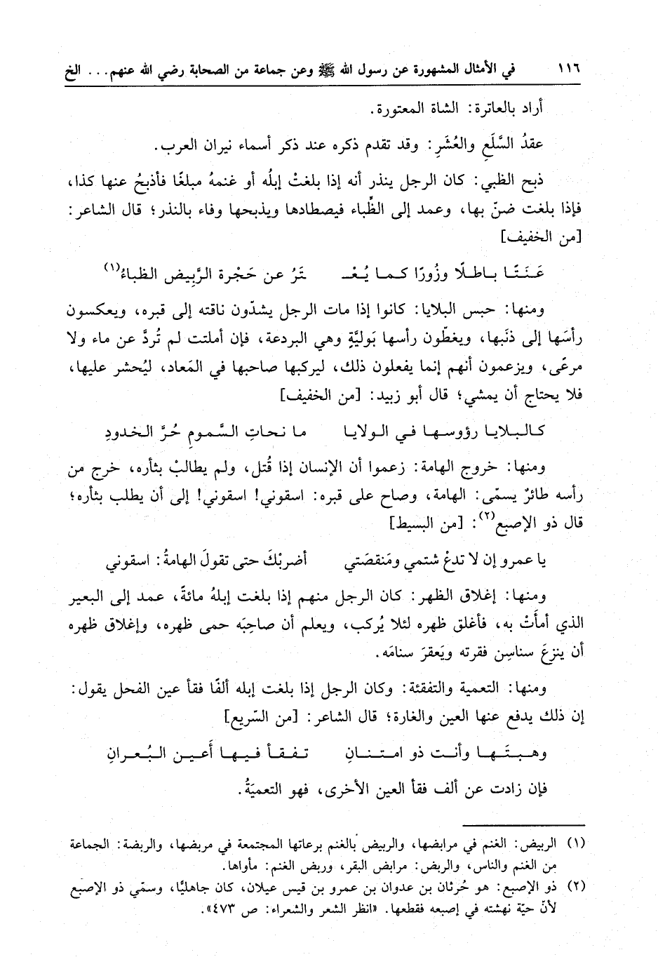 ومنها : خروج الهامة : زعموا أن الإنسان إذا قتل ، ولم يطالب بثأره ، خرج من رأسه طائرٌ يسمى : الهامة ، وصاح على قبره : اسقوني اسقوني إلى أن يطلب بثأره ، قال ذو الإصبع
